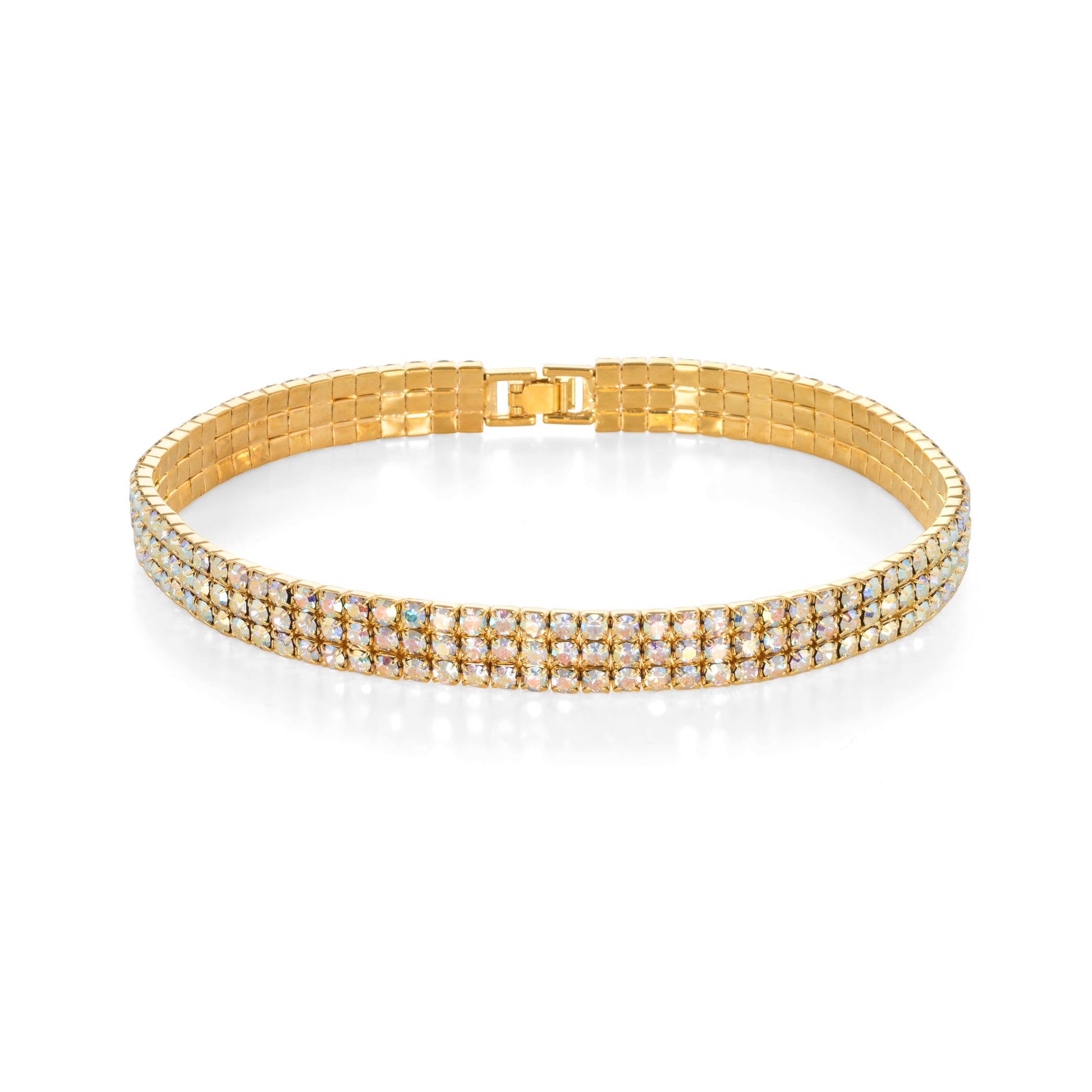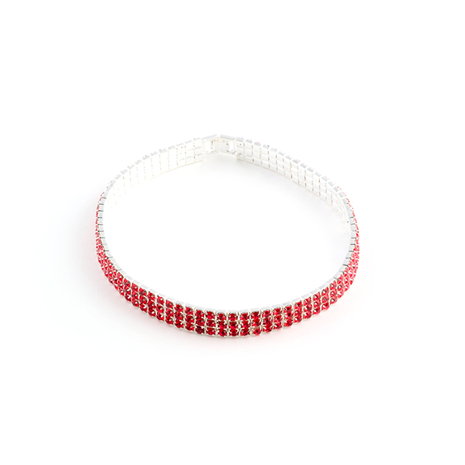 This triple row rhinestone choker is crafted with a clear elastic stretch band and a clasp back for a snug and flexible fit. Snag-resistant. Available in 12"L or 13"L clasp back. Colors available: silver, iridescent, gold/iridescent, and red. The model pictured is wearing iridescent. Width 11mm