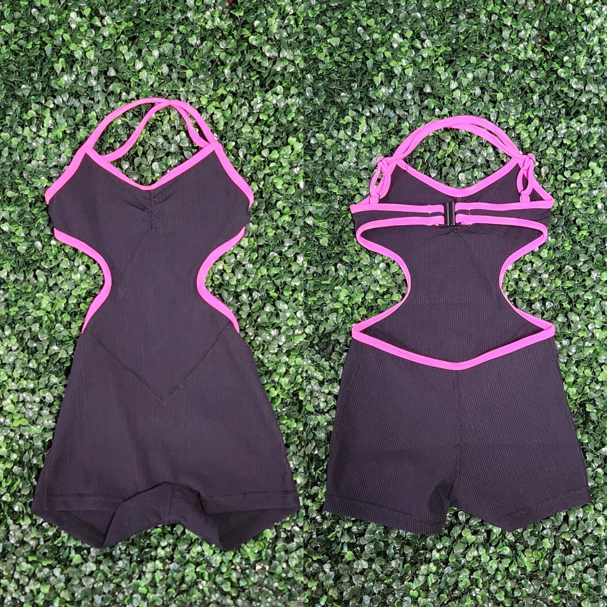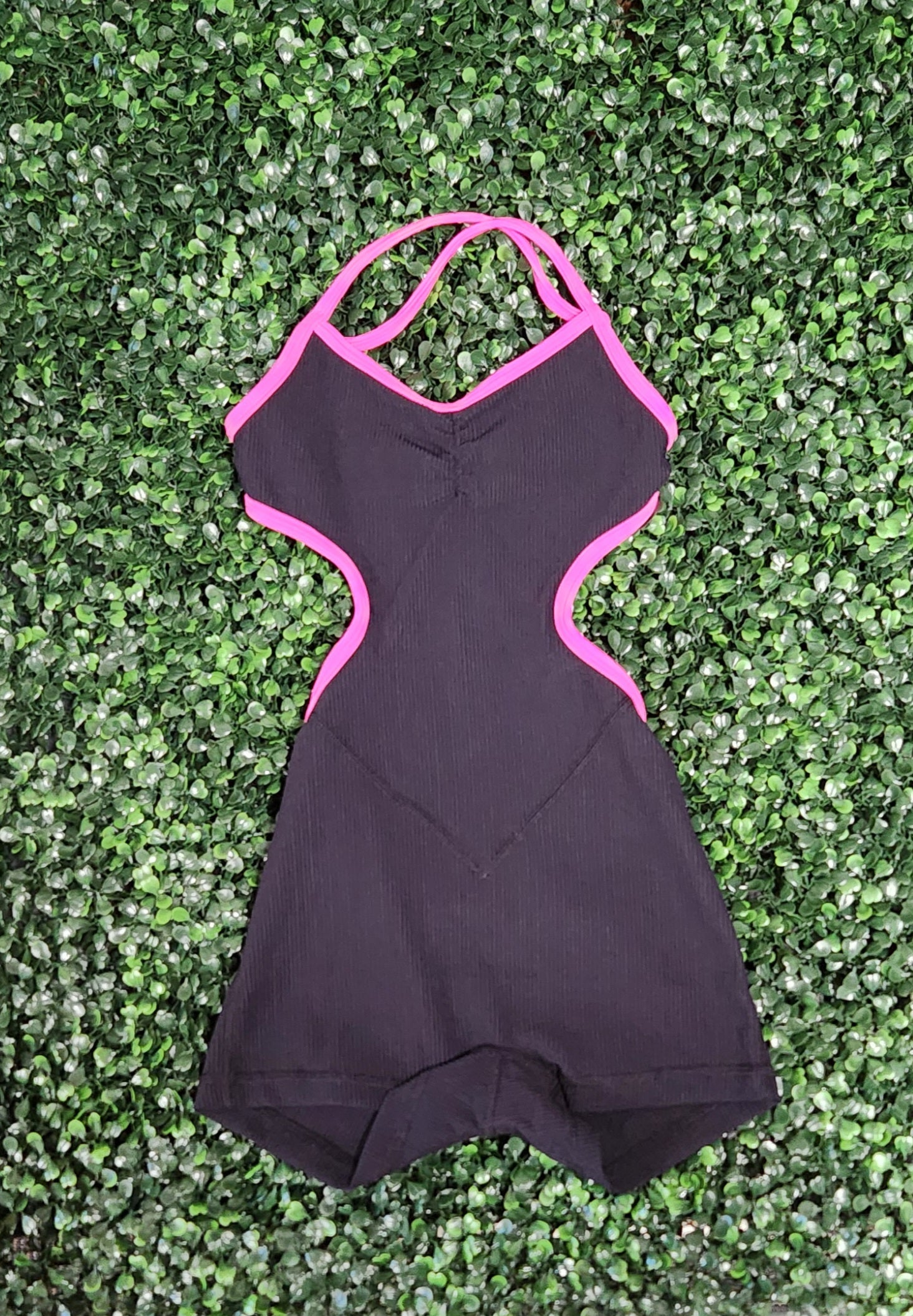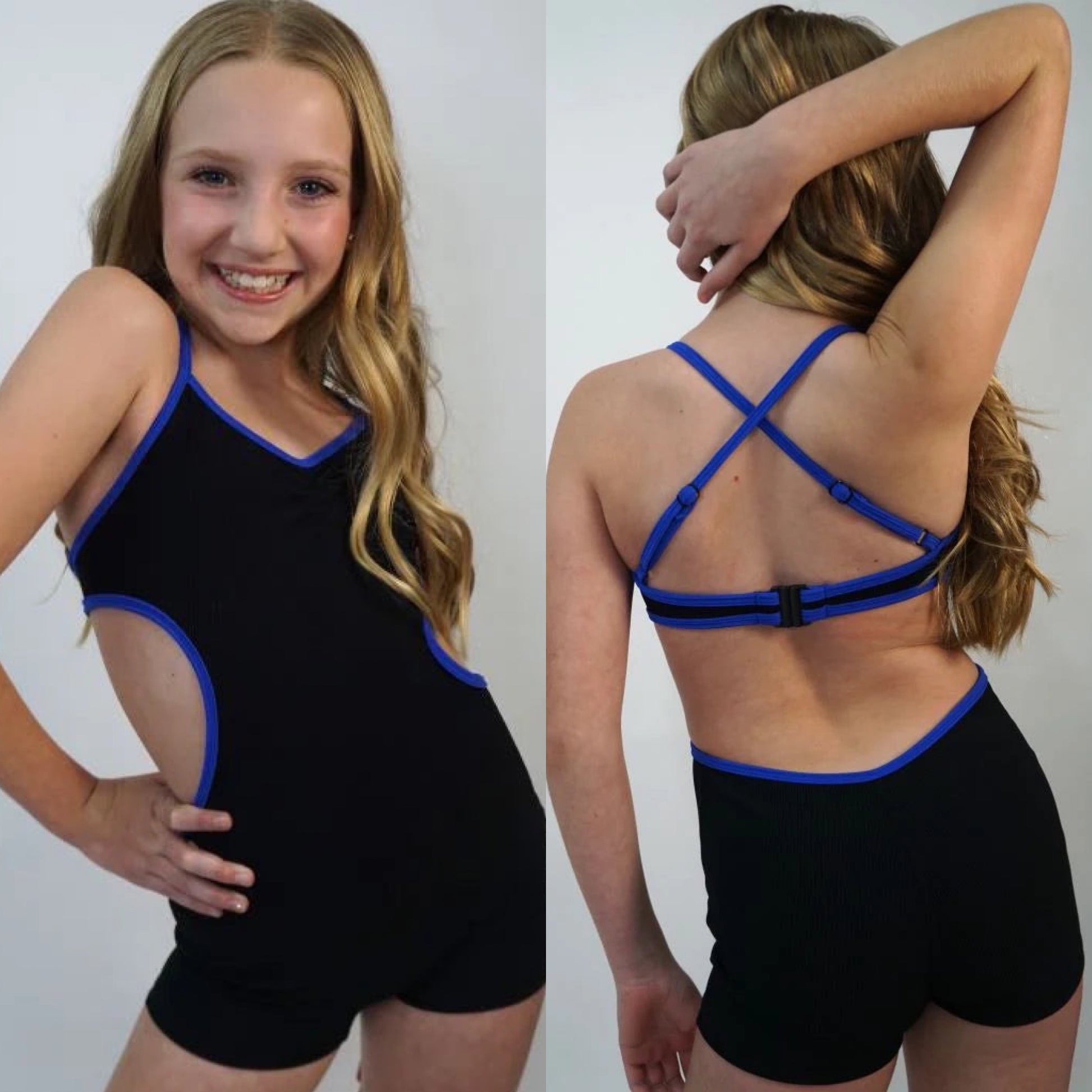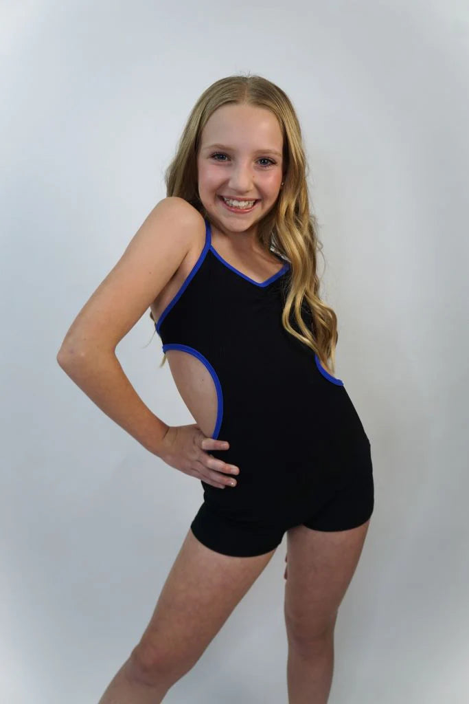 A one piece biketard with side cuts and criss cross straps in the back.