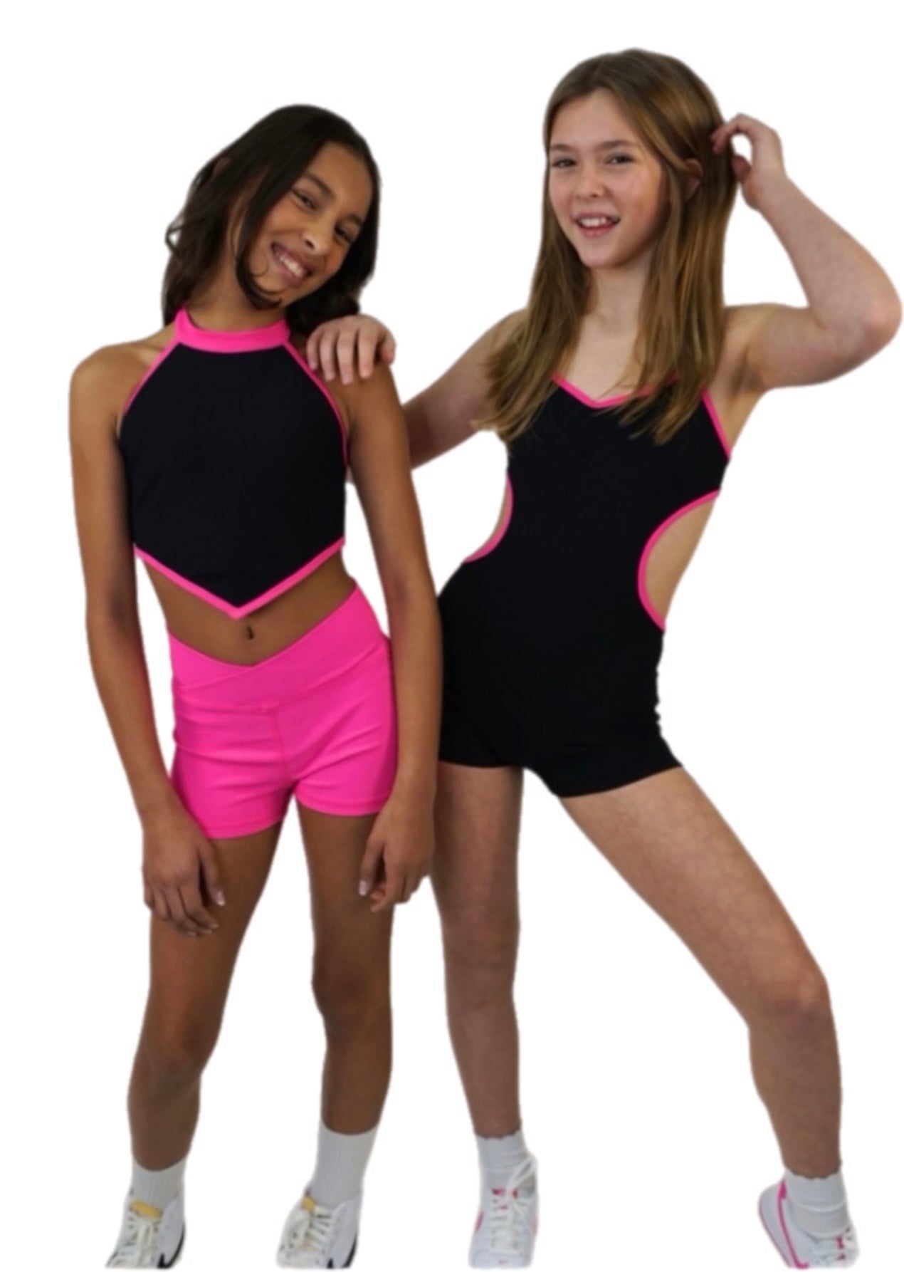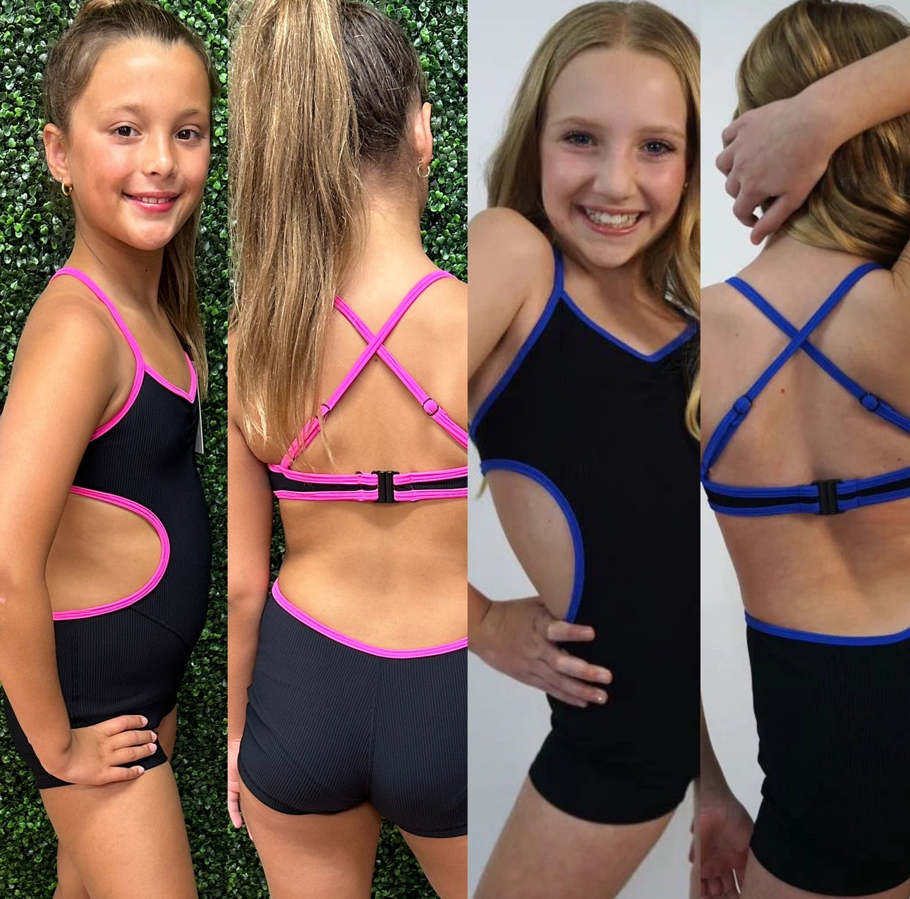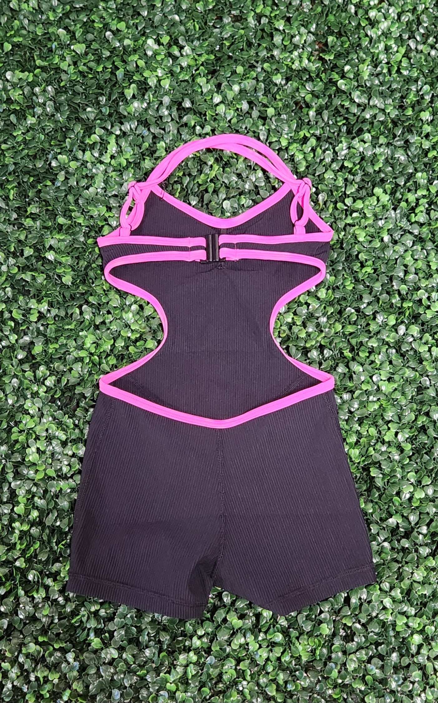 A one piece biketard with side cuts and criss cross straps in the back.