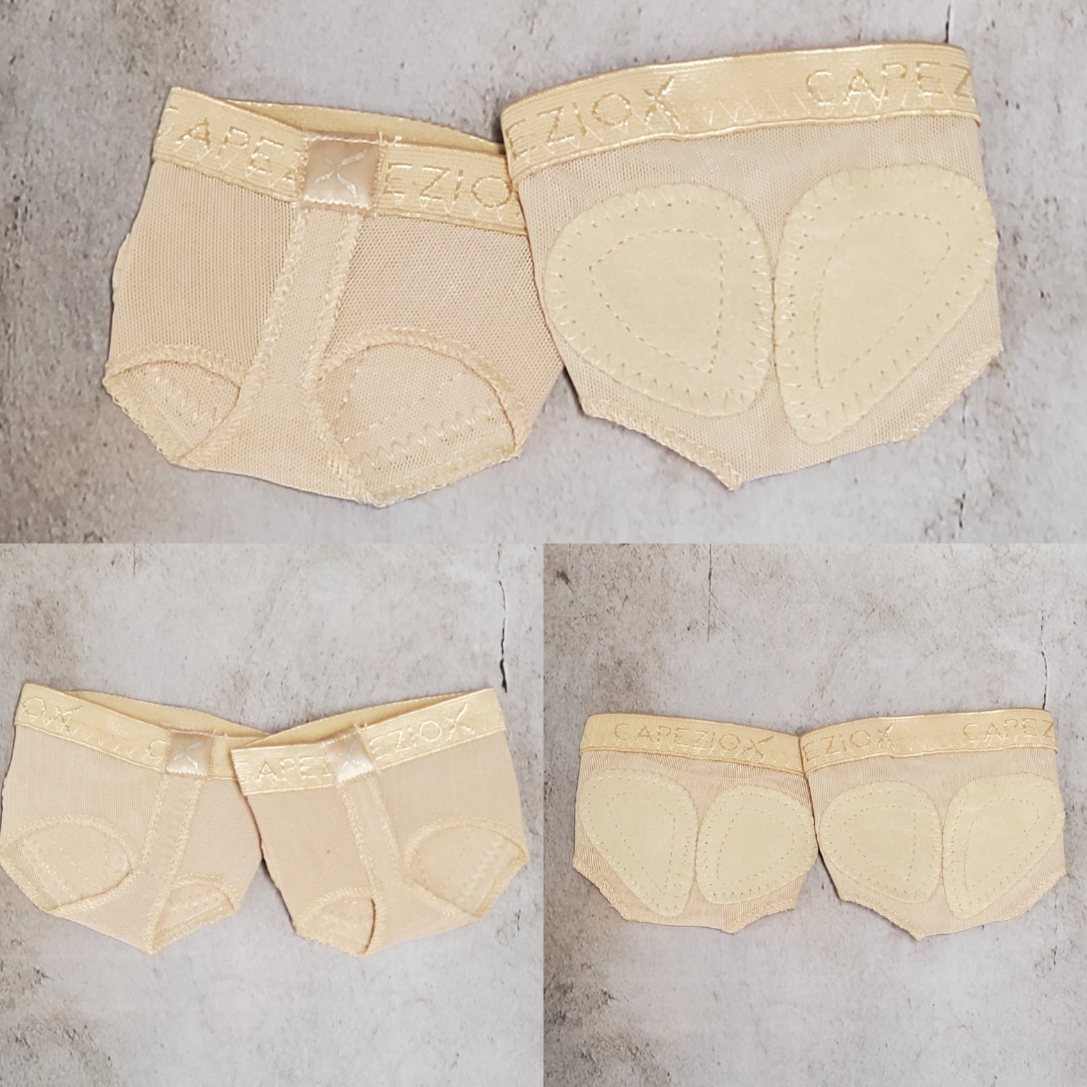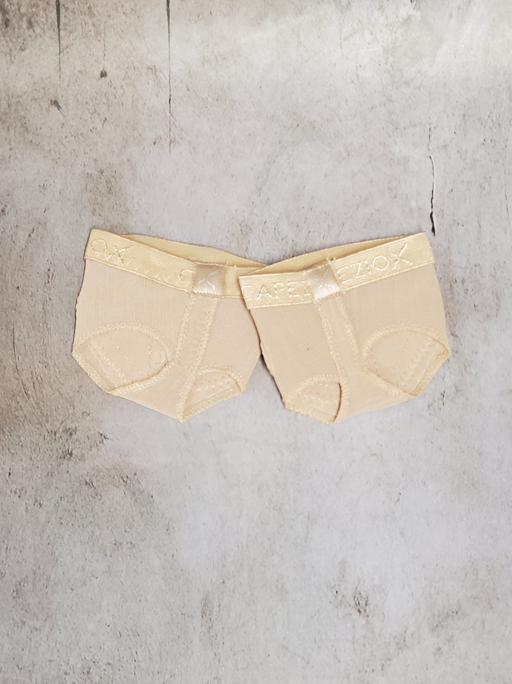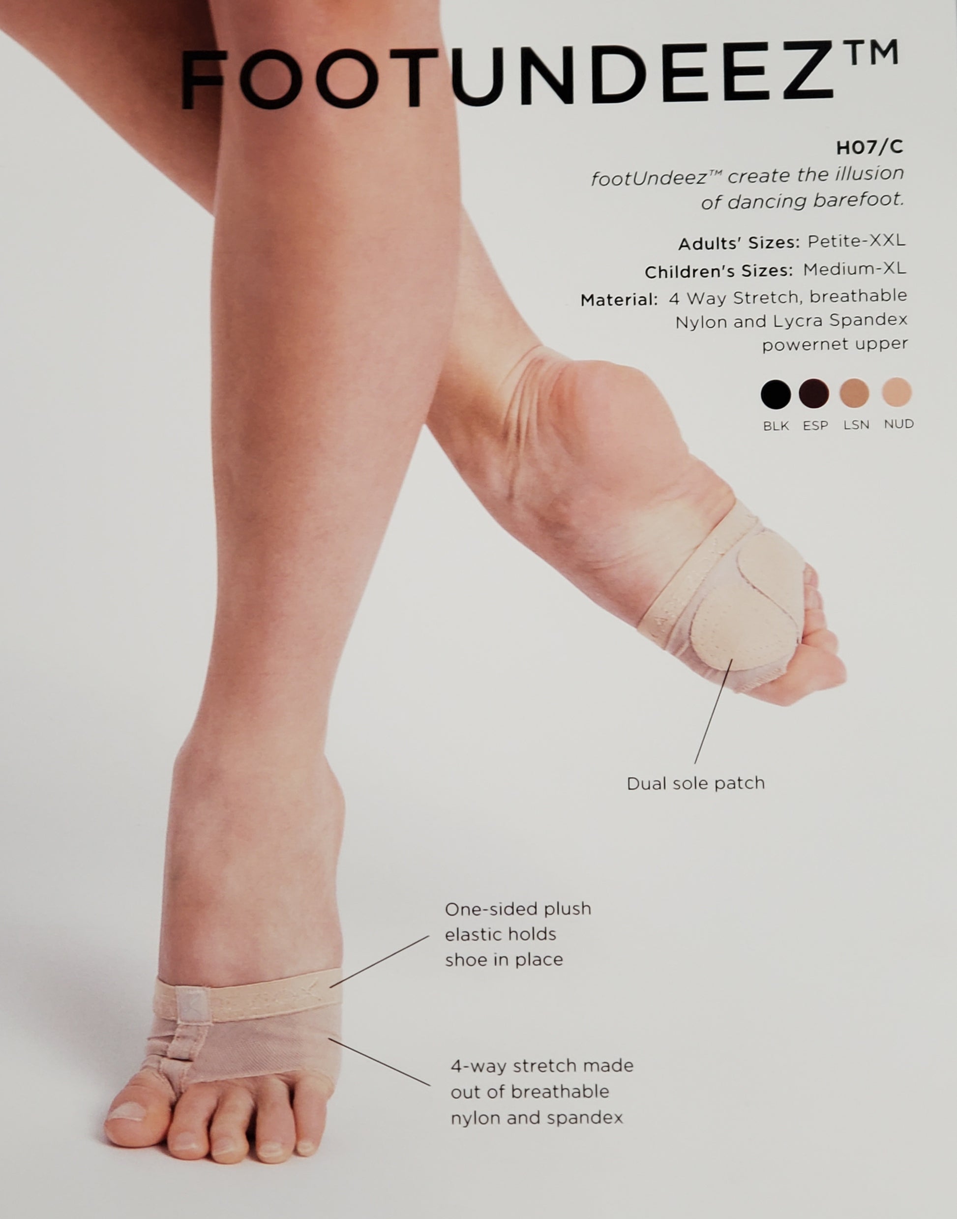 footUndeez™ create the illusion of dancing barefoot. Its four way stretch spandex material is both breathable and stable thanks to the sewn in fore foot pads. The one-sided, Capezio logo elastic holds footUndeez™ in place during every pirouette. Recommended for lyrical and modern classes.