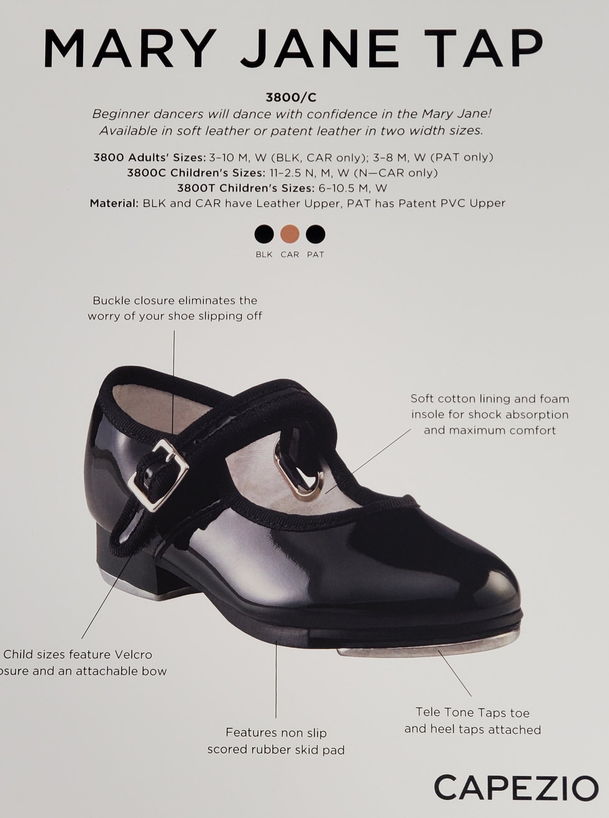 Young dancers will take their first steps with confidence in the Mary Jane Tap Shoe. Comes in shiny black patent leather, black PU leather or caramel PU leather. Features non-slip heel counter, soft cotton lining and foam insole for shock absorption. Buckle closure eliminates the worry of the tap shoe slipping off during warm-ups. Highly recommended for beginner tappers.