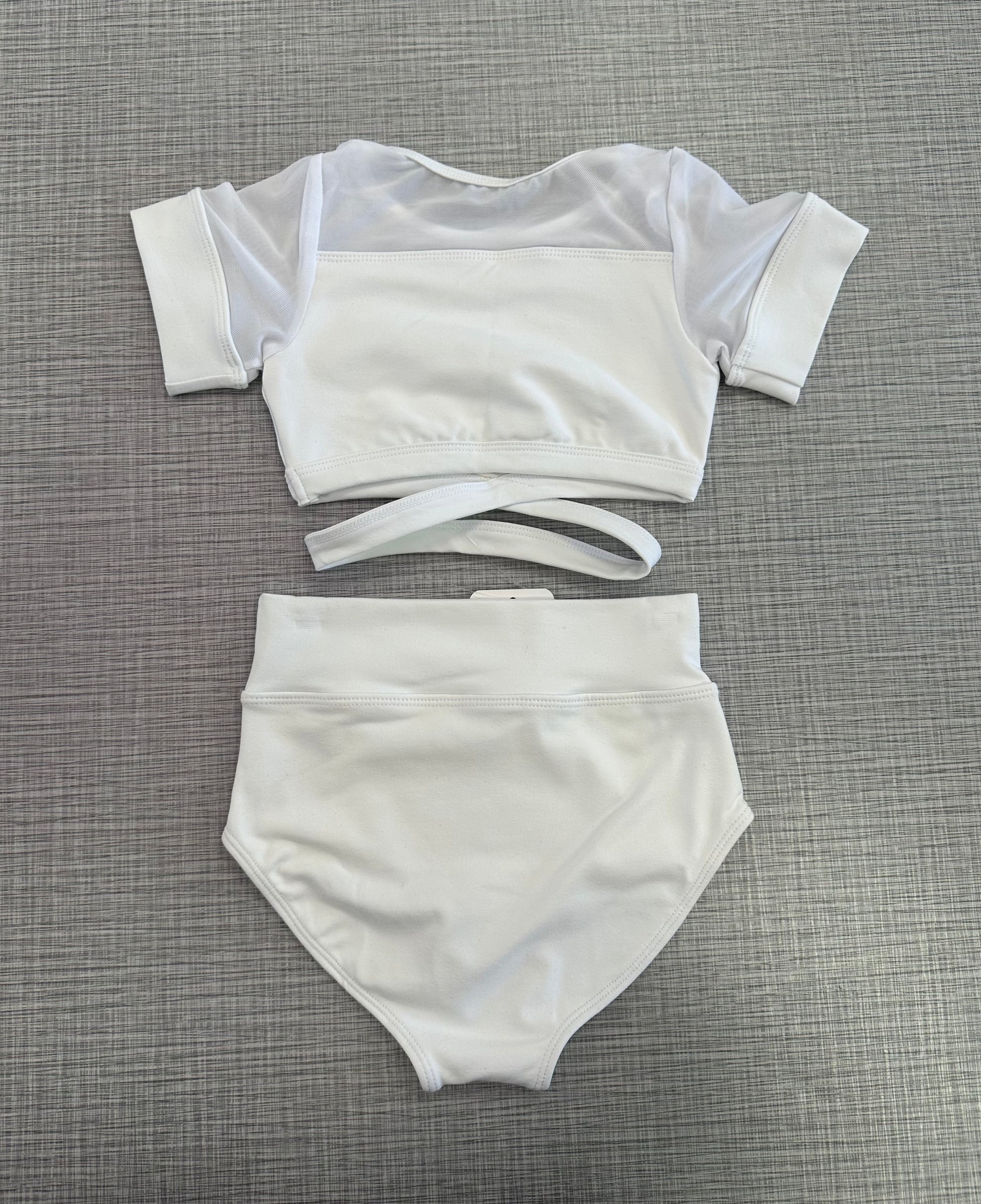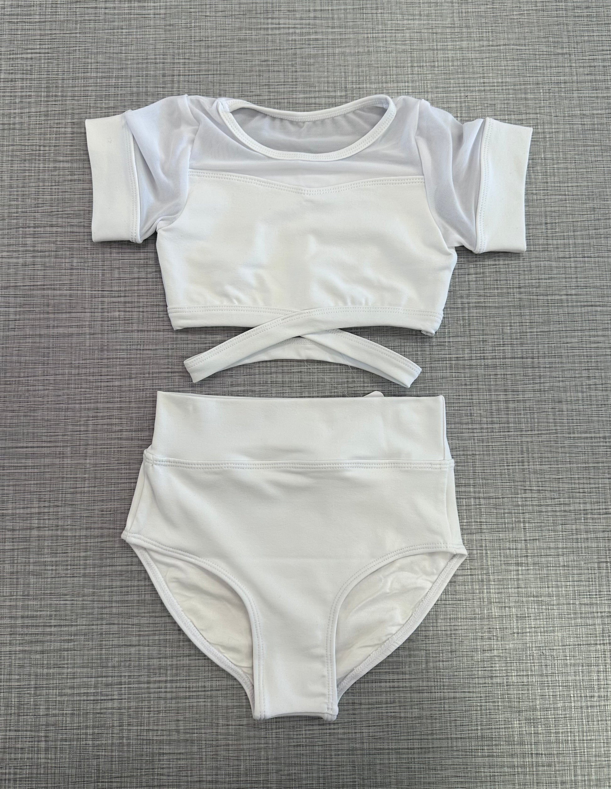 White cap sleeve with mesh sleeve paired with a white brief.
