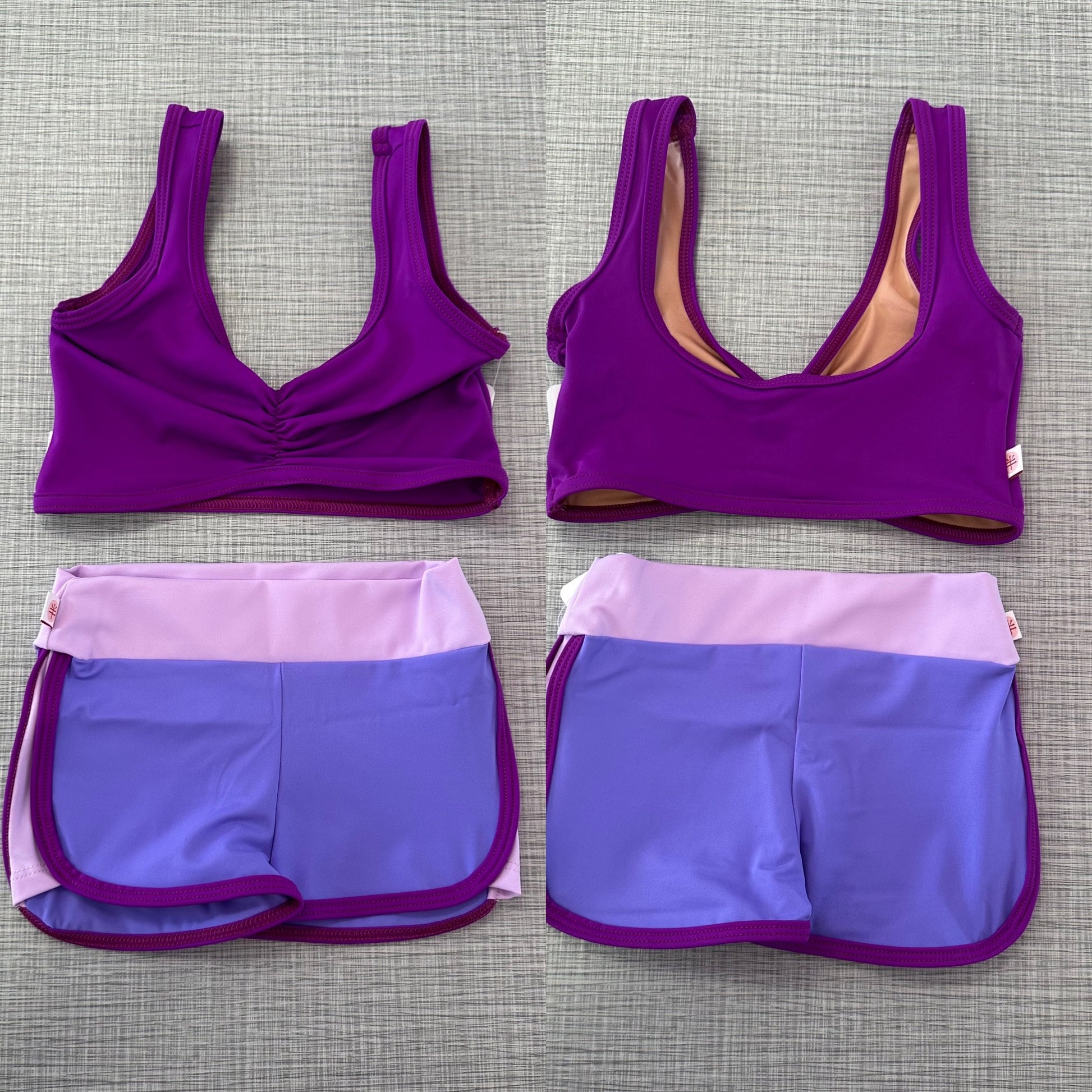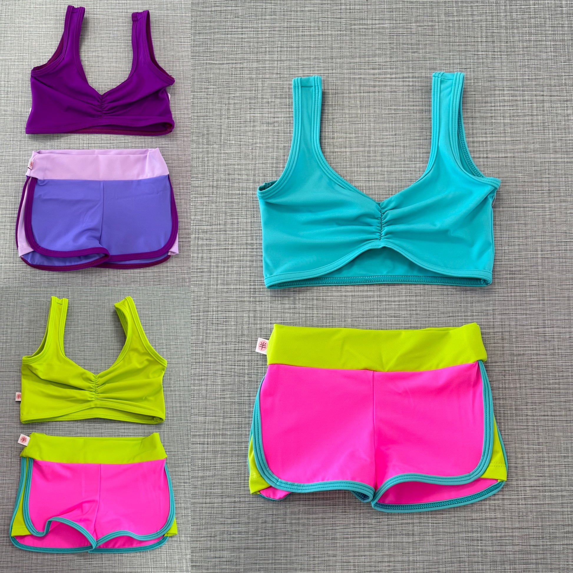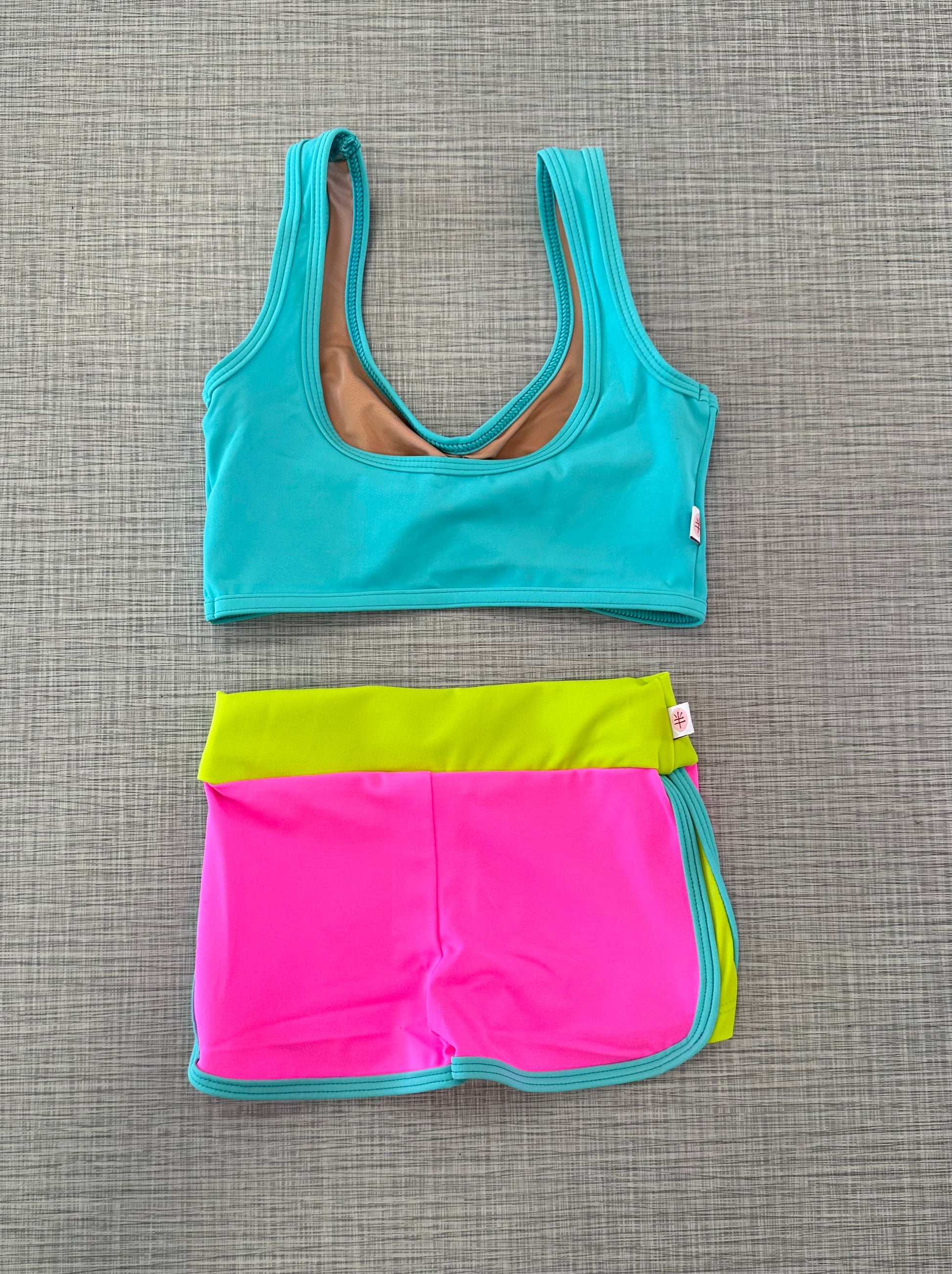Pinch front top paired with multi color training shorts.