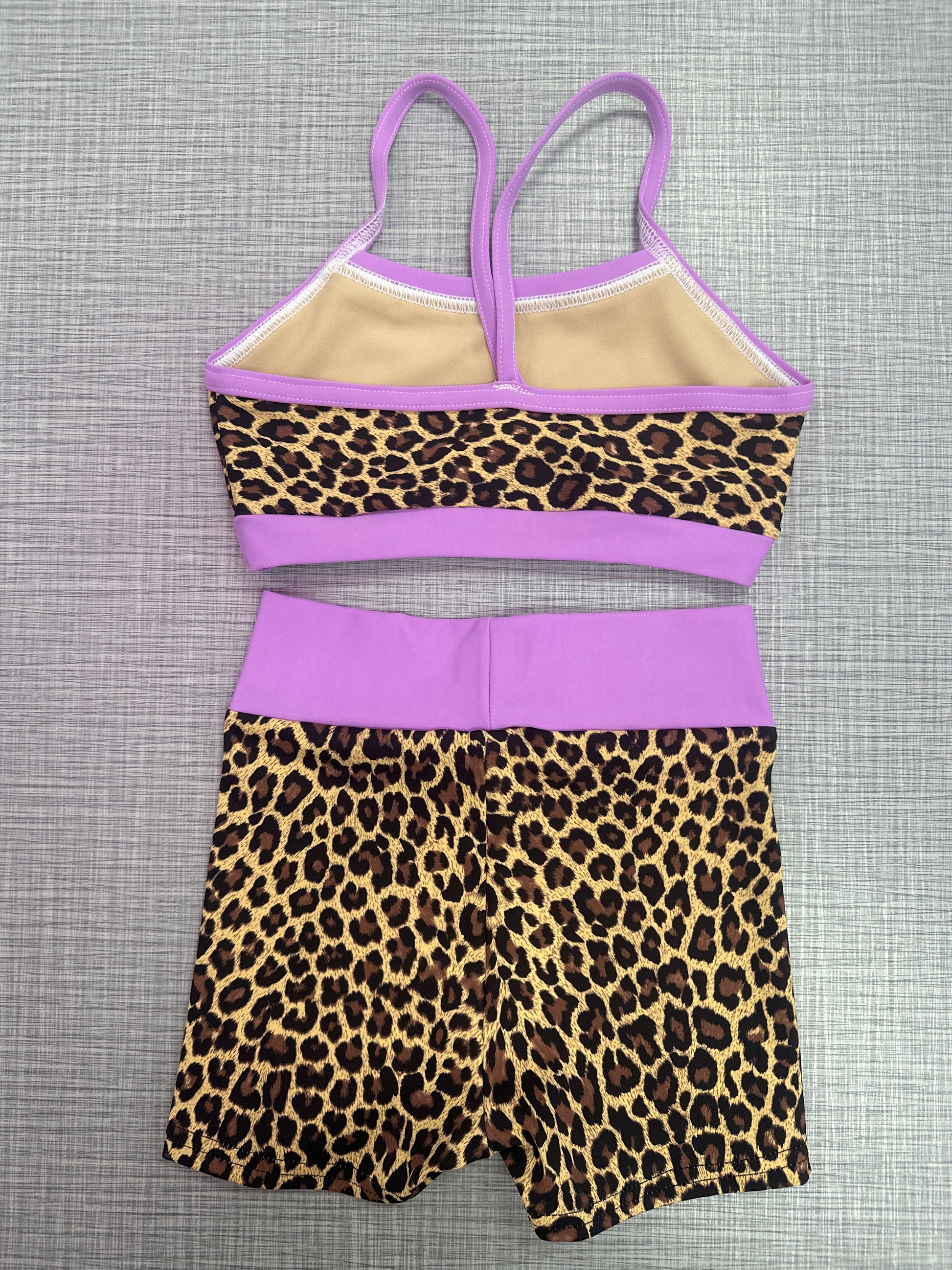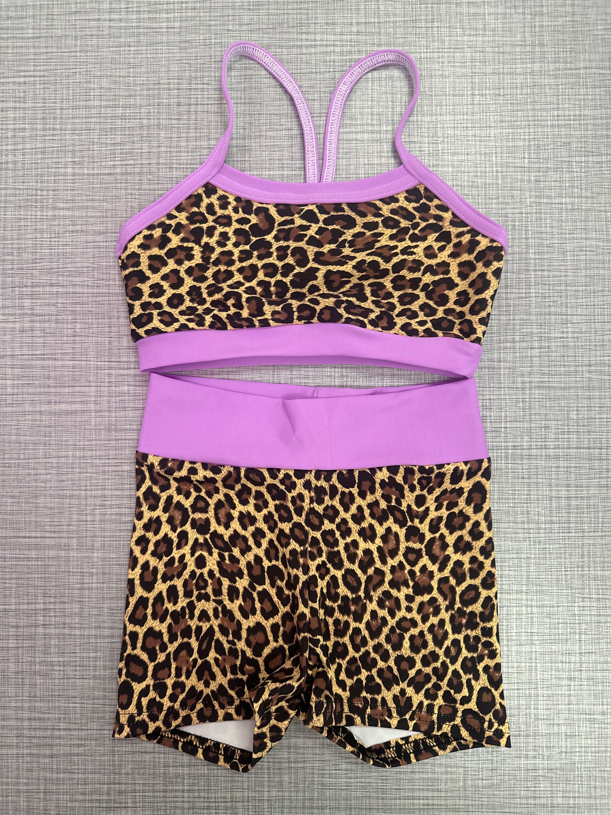 Cheetah top trimmed in lilac paired with cheetah shorts with lilac band.