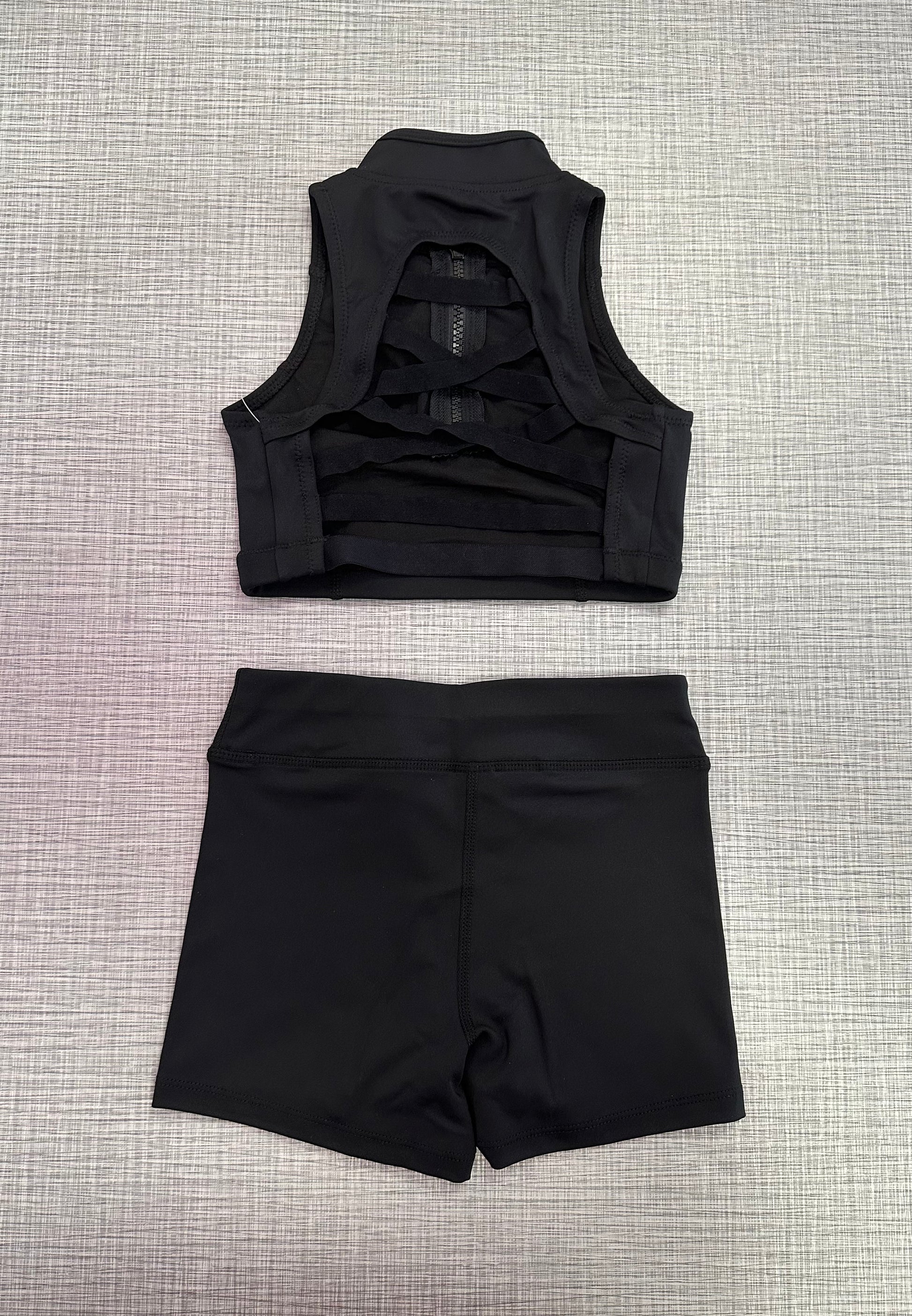 Zip front tank top with elasticized crisscross strap detailing at back. Fully front lined. Polyester/Spandex. Similiar to the old scuba tops.
