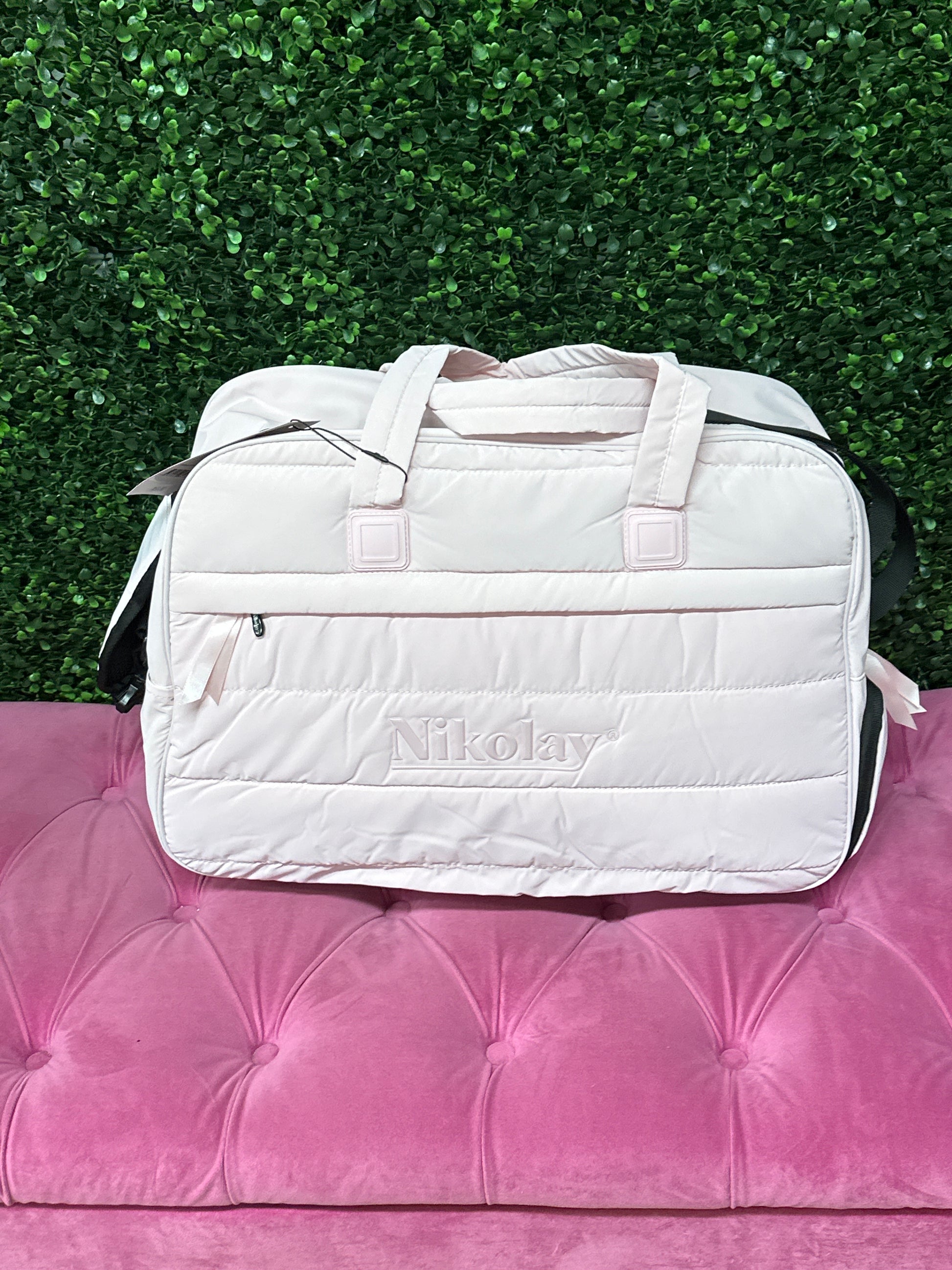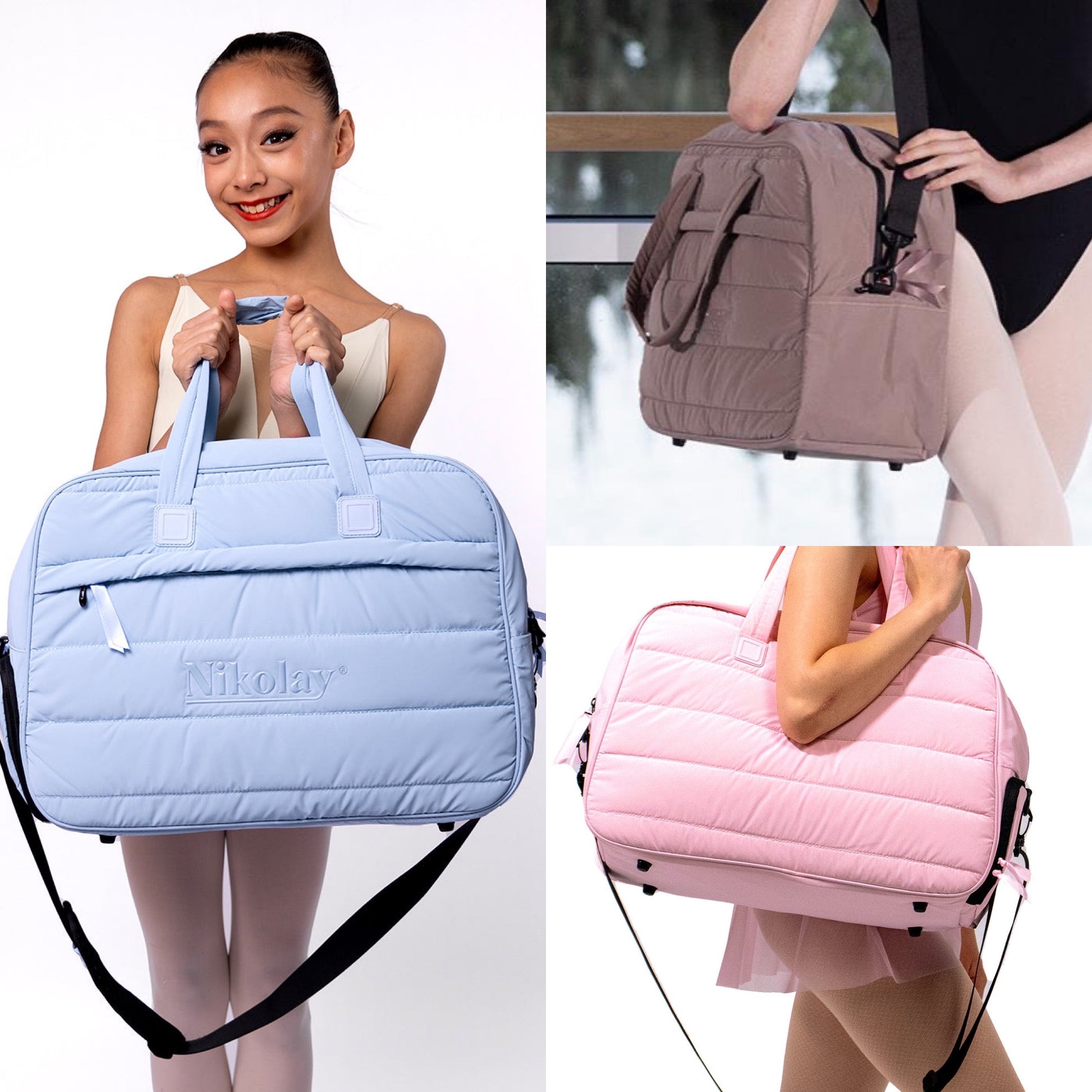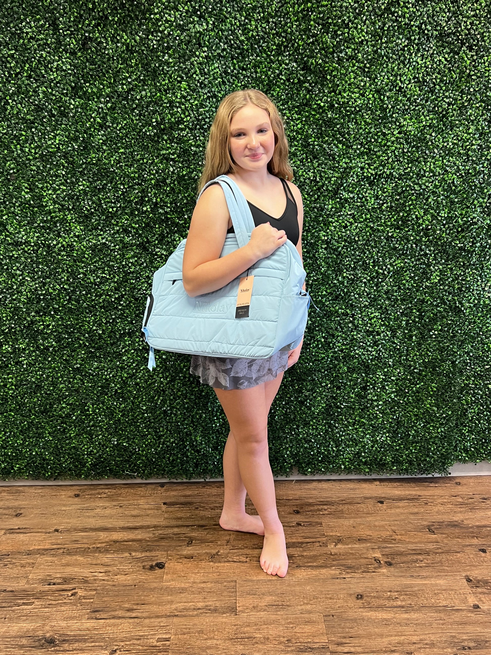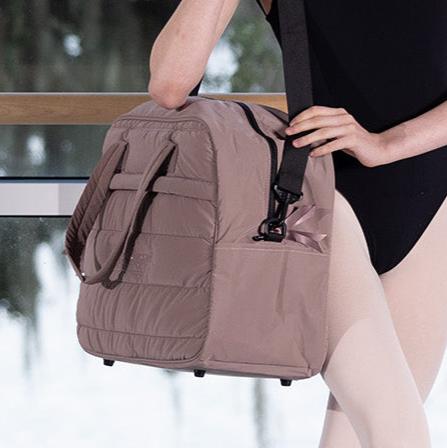 Crafted from our quilted material and available in four vibrant colors, it’s designed to keep up with your every move. The spacious main compartment ensures you have room for all your essentials, while two handy outer pockets provide a convenient spot for separating wet or dirty items. Measuring approximately 19 inches by 13 inches, this duffel is the ideal size for every dancer on the go.