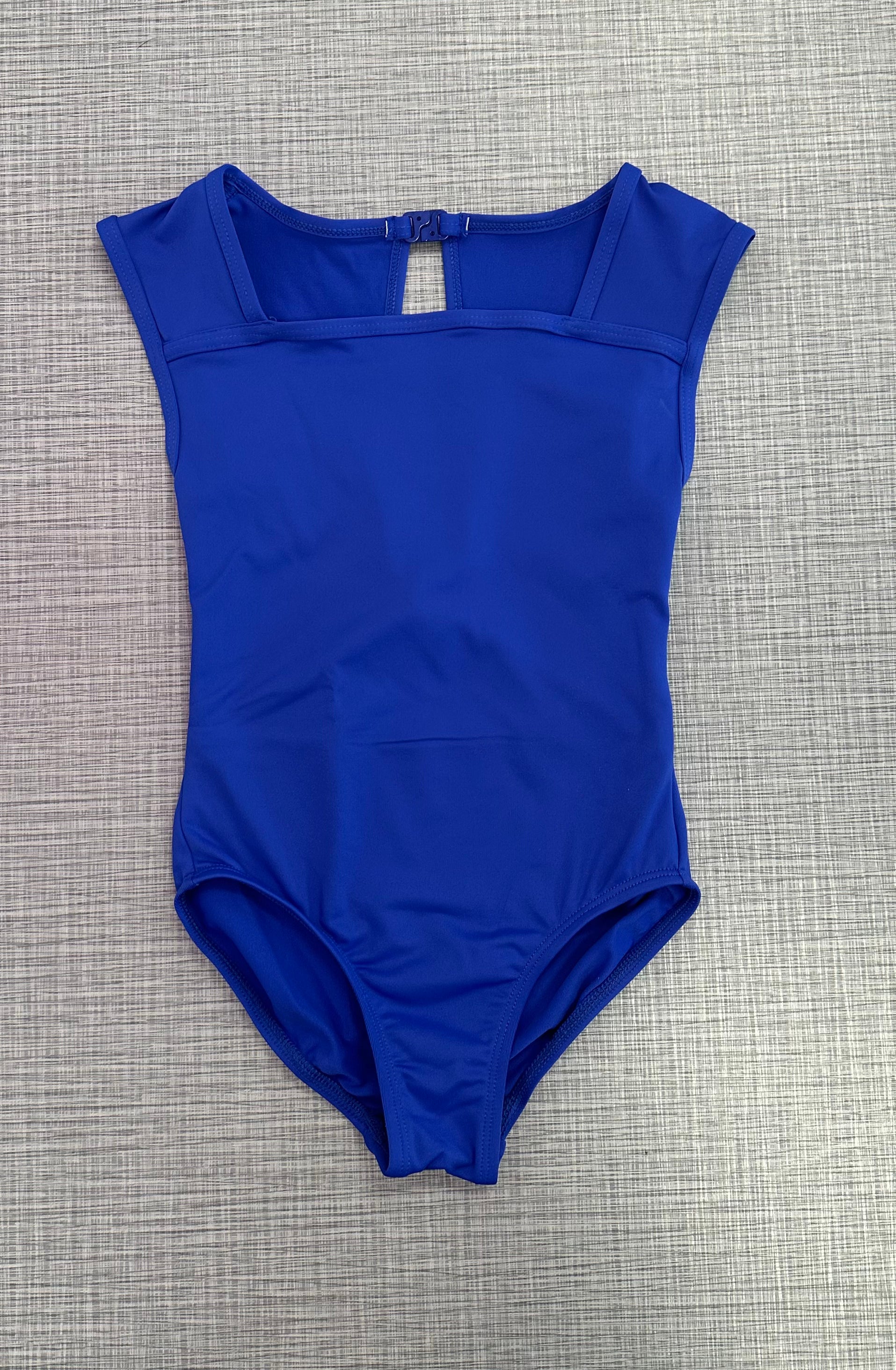 Square neck cap sleeve leotard with binding at neck and sleeves. Features stylized double keyhole at back. Girls fully front lined.