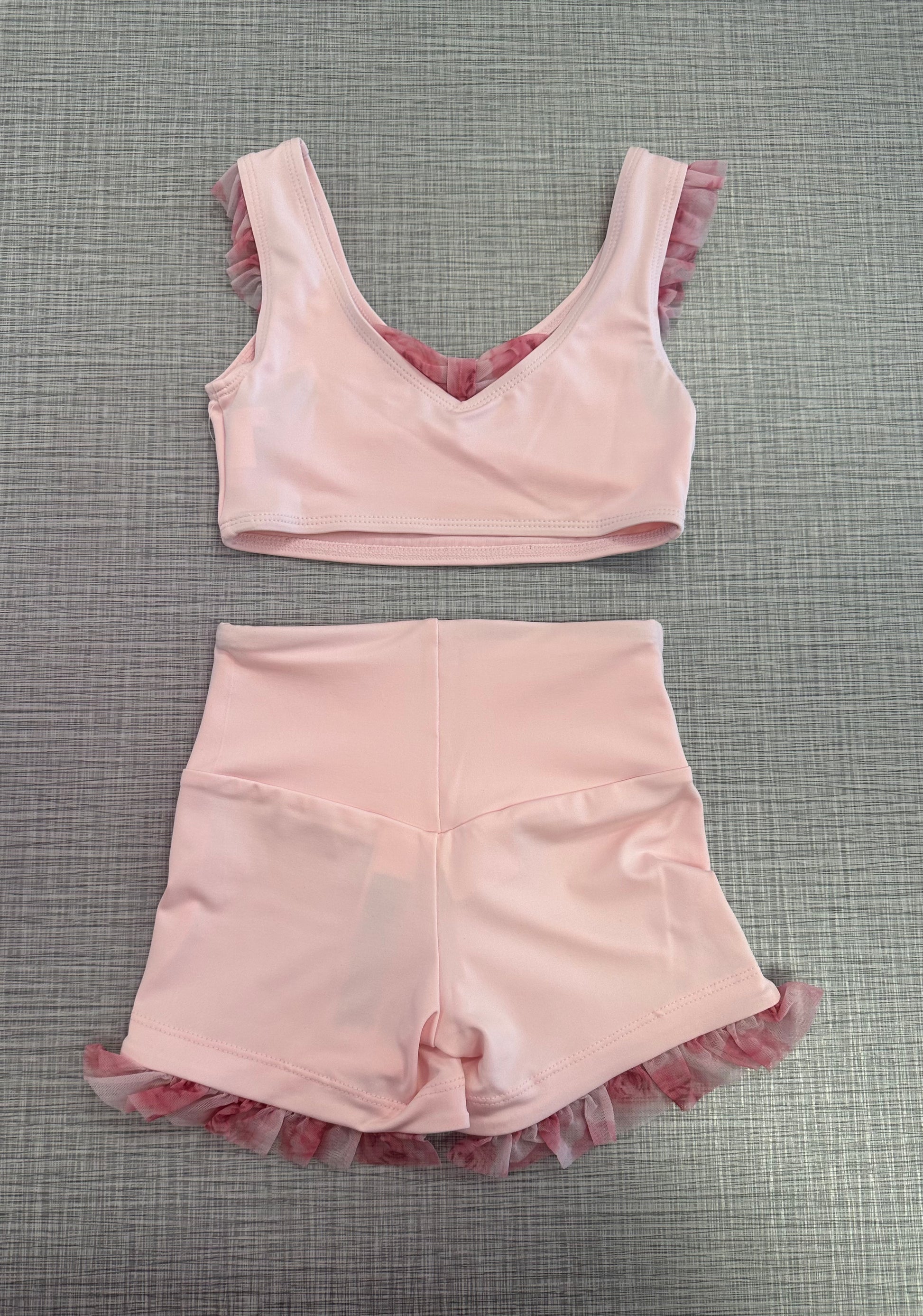 The Fleur Short from the limited edition Coming Up Roses collection is both playful and practical. Designed with a low V-shaped waistband at the front and back, these shorts feature a delicate mesh ruffle trim at the leg openings, adding a graceful touch. The Fleur Short pairs perfectly with the Rosy Top.