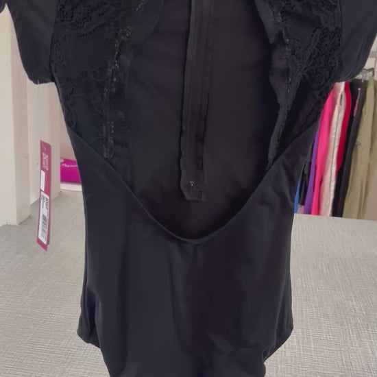 The Short Sleeve Princess Leotard combines elegance and fun in one stylish piece! With a sleek mock neck and short sleeves, it’s perfect for both comfort and flair. The zipper front makes it easy to slip on, while the princess seams and lace panels add a beautiful, feminine touch. The playful triangle cut-out at the back brings a unique twist, and the ballet leg line allows for total freedom to move.