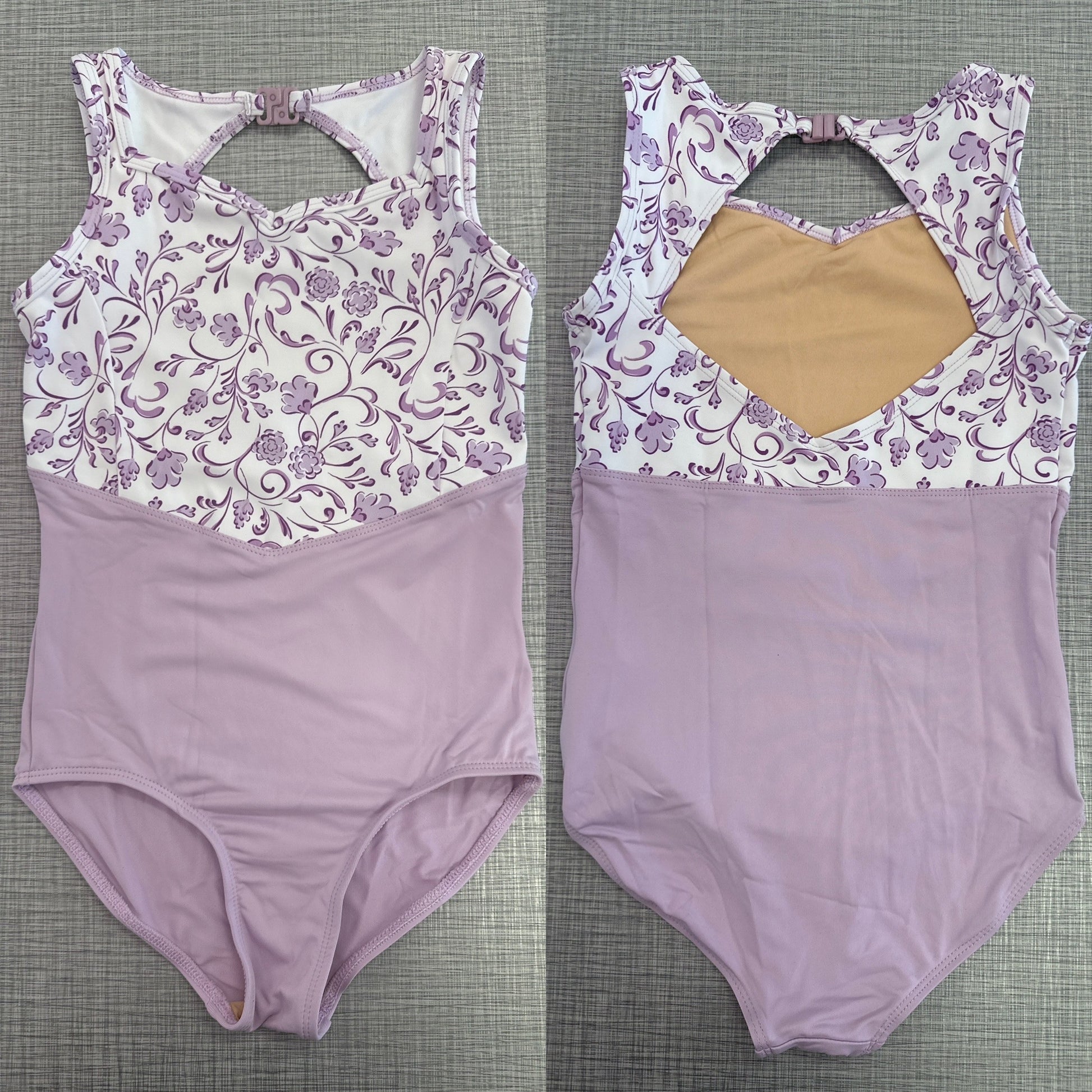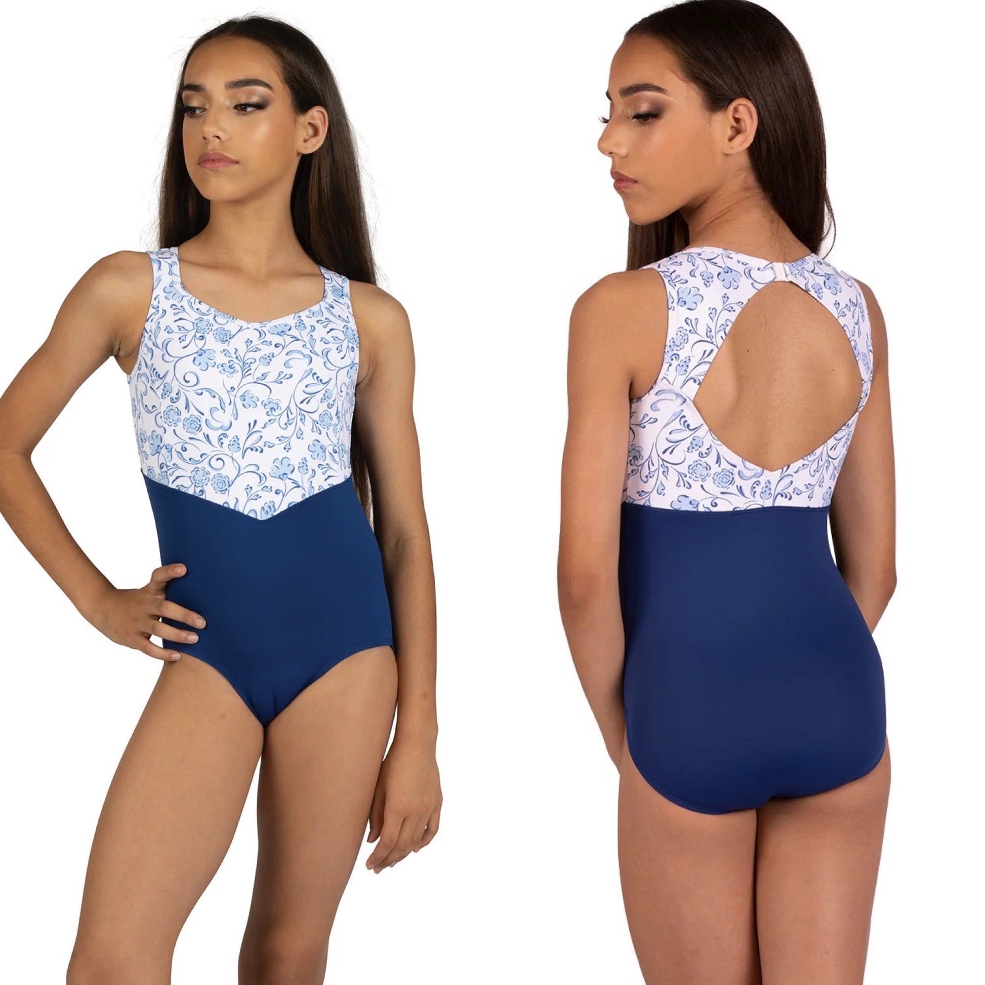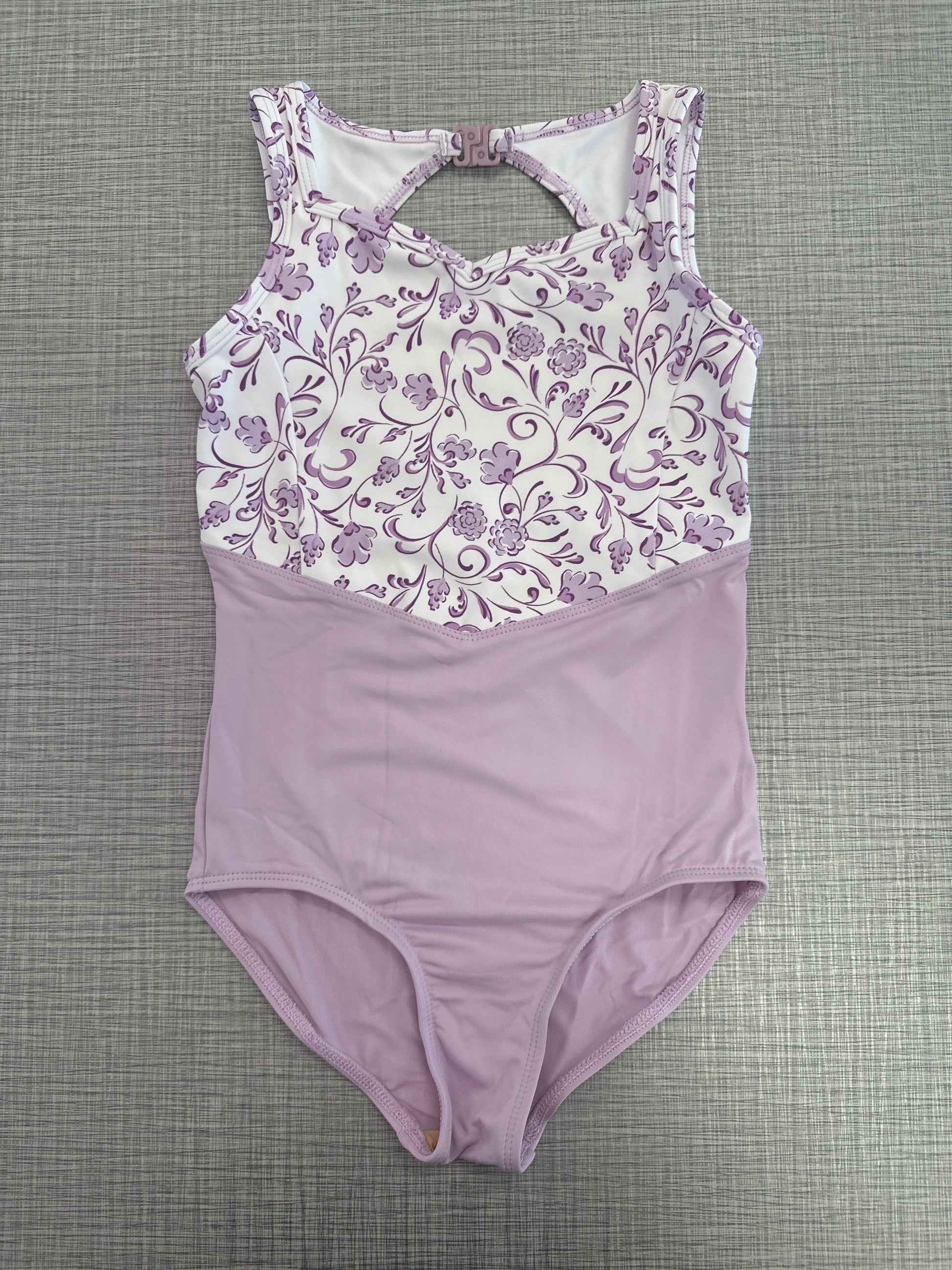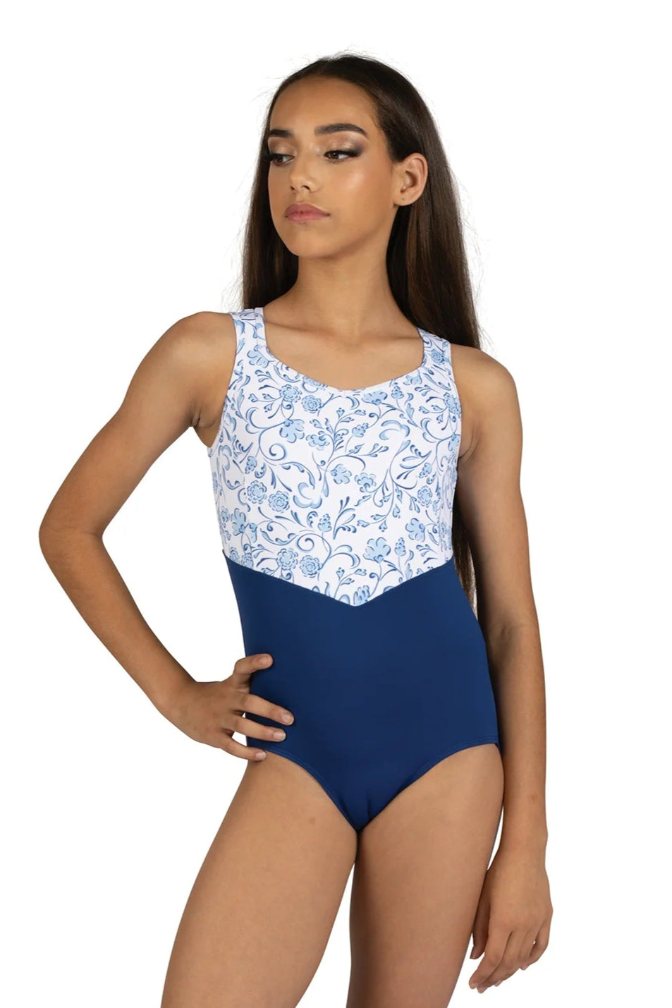 Two-tone floral tank leotard with rounded sweetheart neckline and princess seams. Features floral printed top with solid bottom. Fully front lined.