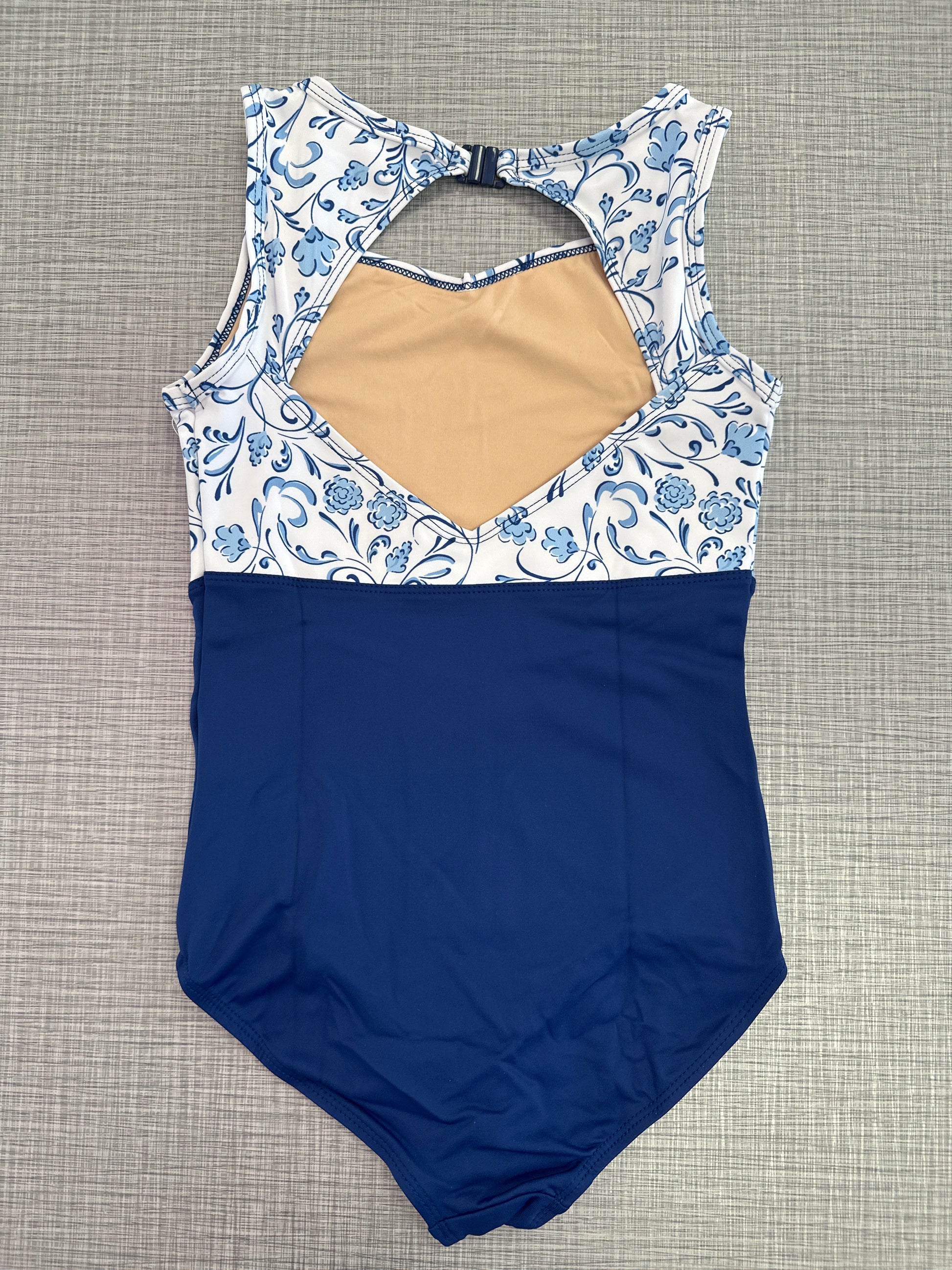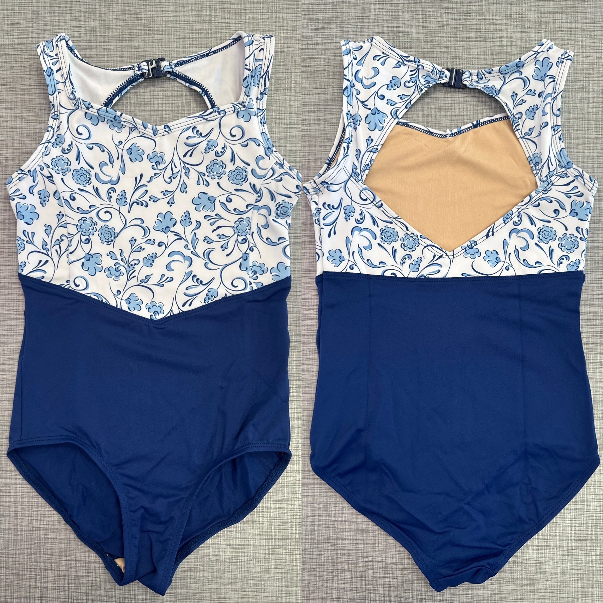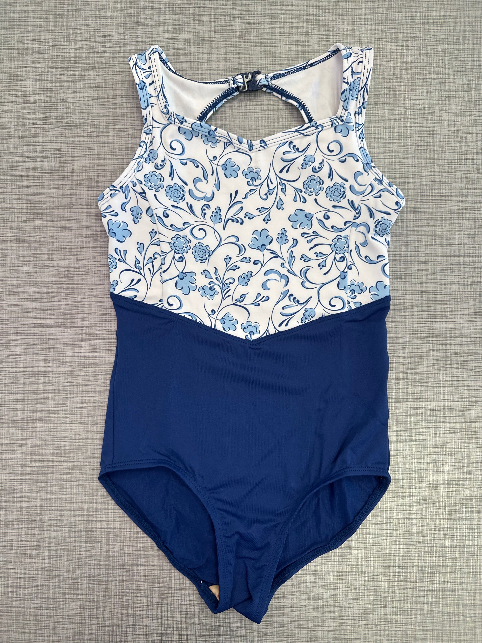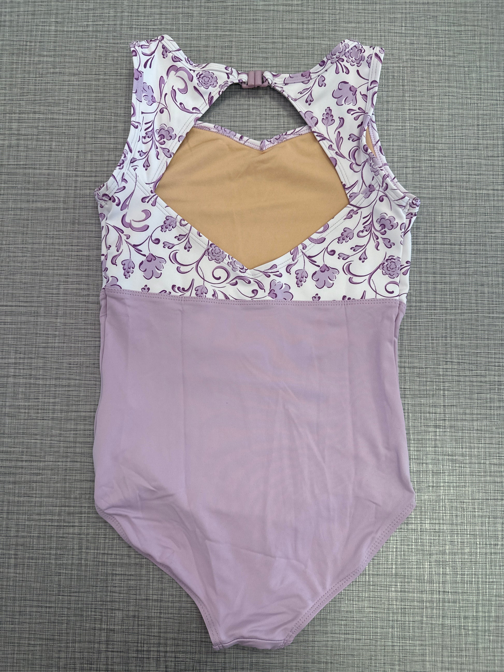 Two-tone floral tank leotard with rounded sweetheart neckline and princess seams. Features floral printed top with solid bottom. Fully front lined.