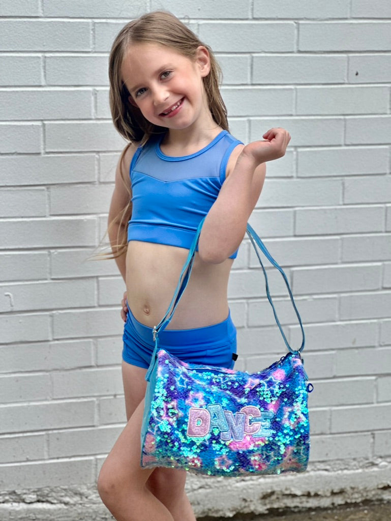 Wow! This super cute sparkly sequin bag will be on every kid’s wish list. This dance duffel features a vibrant colorful sequin outer fabrication highlighted with stars and the word “DANCE” in glittery pink and blue letters. The two bag ends and adjustable carrying handle/shoulder strap are made from a holographic material, one side includes a zipper pocket. The inside compartment is fully lined, zips closed, wipes cleans and folds flat.