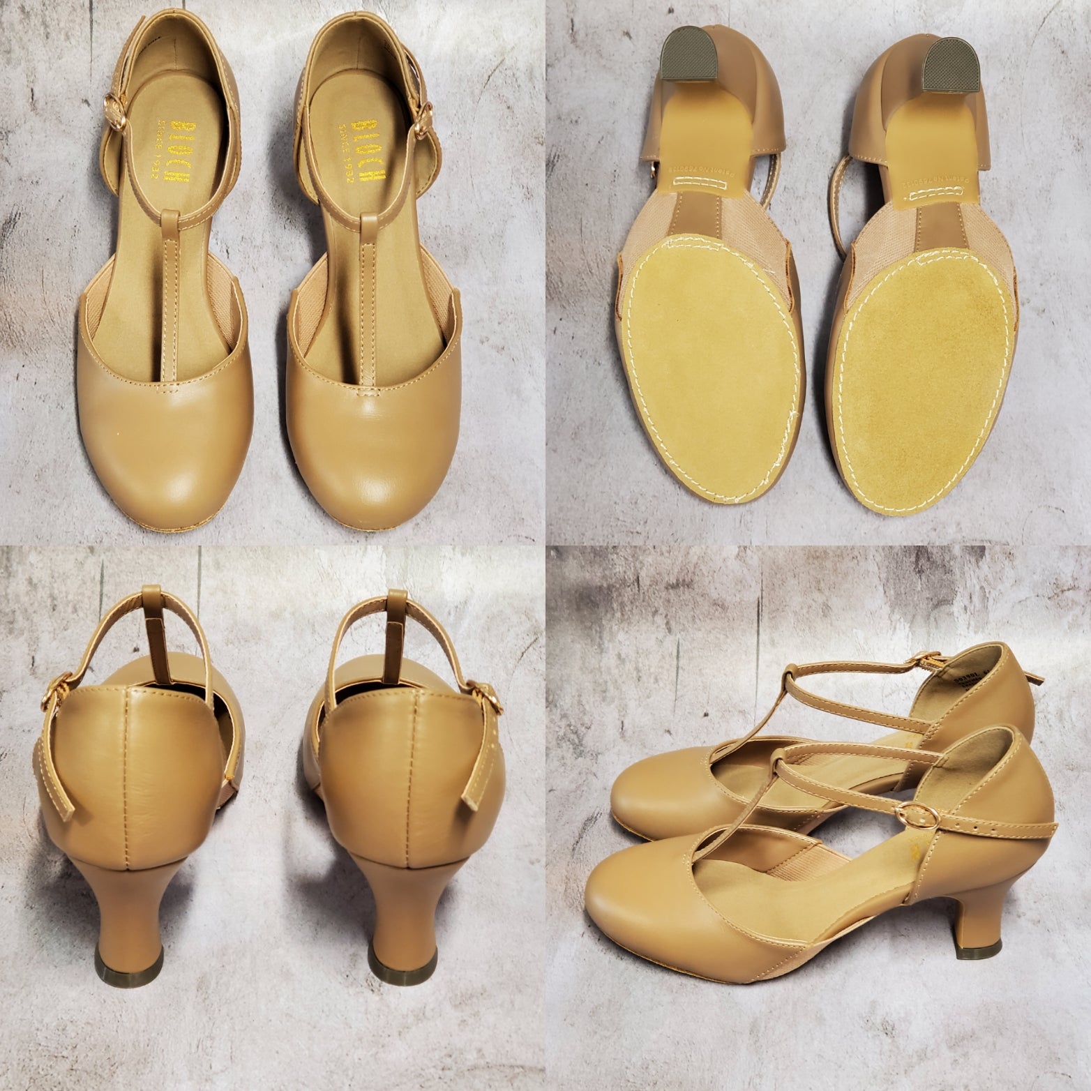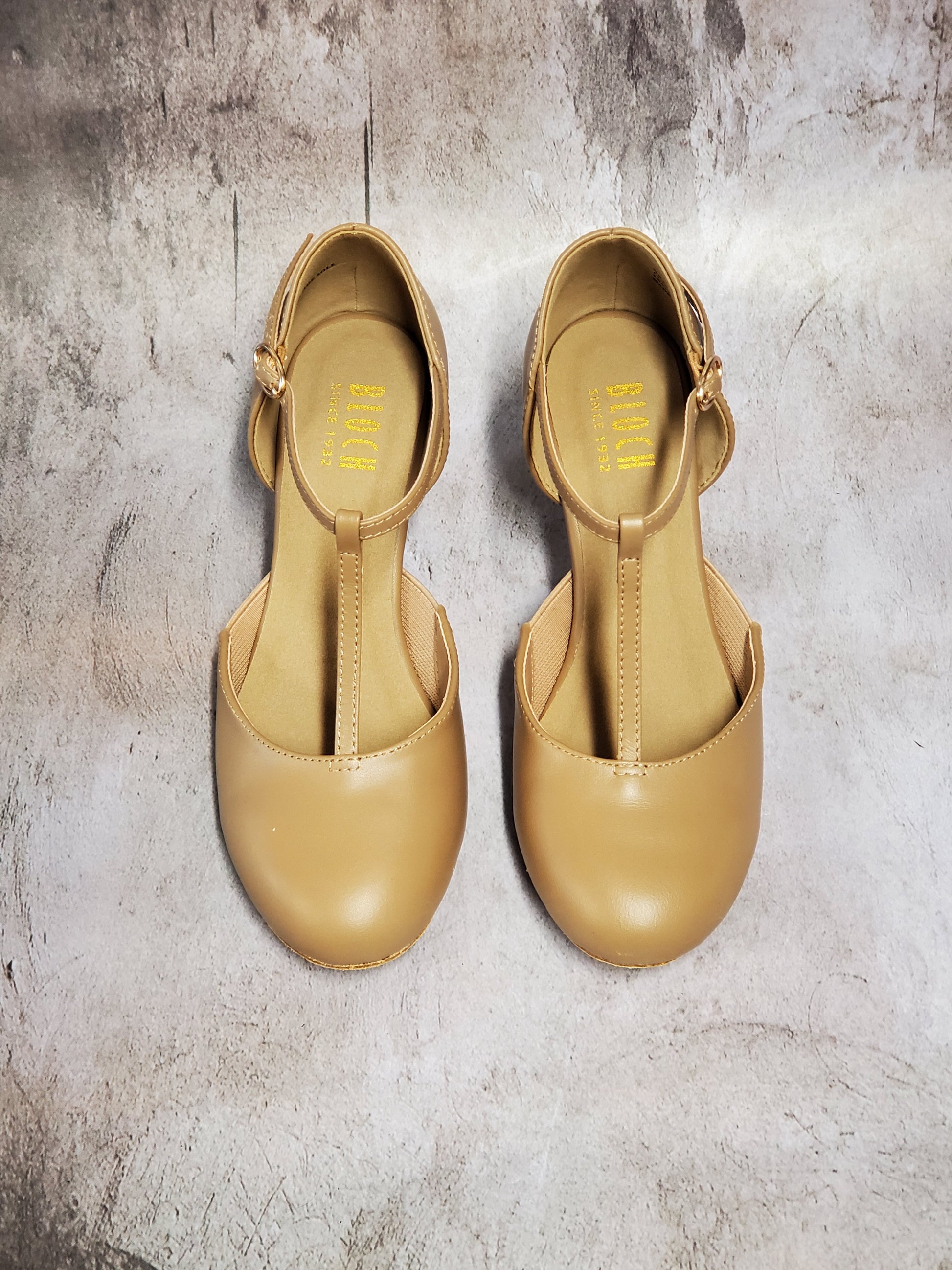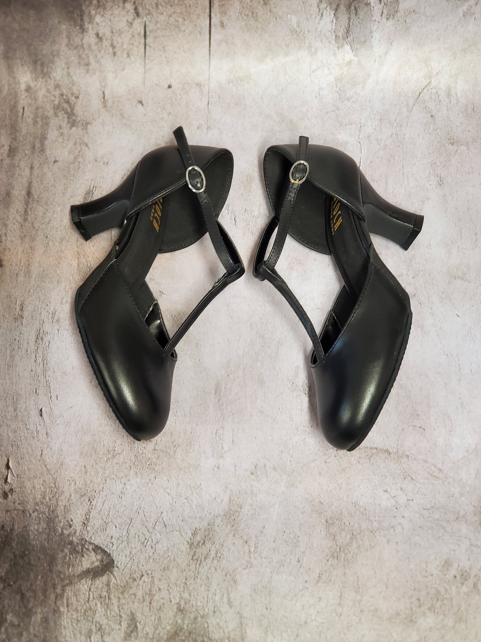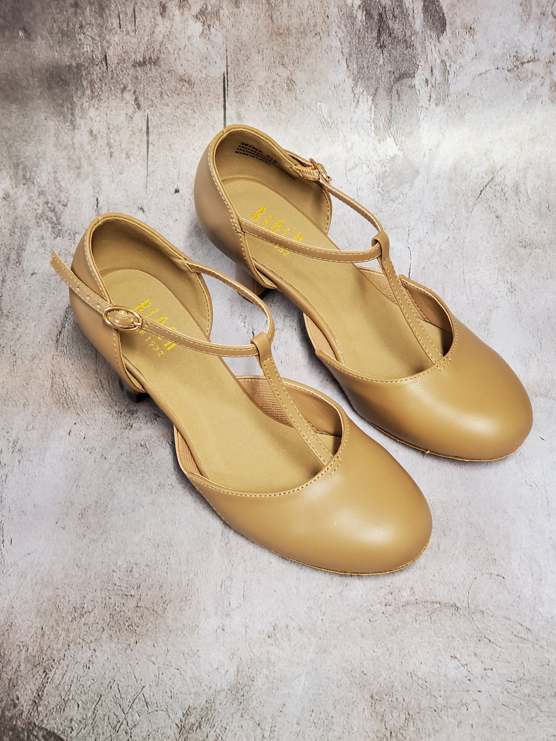 - Ankle T-bar strap with pin buckle attached with elastic to allow movement of the foot while easing tension on the instep