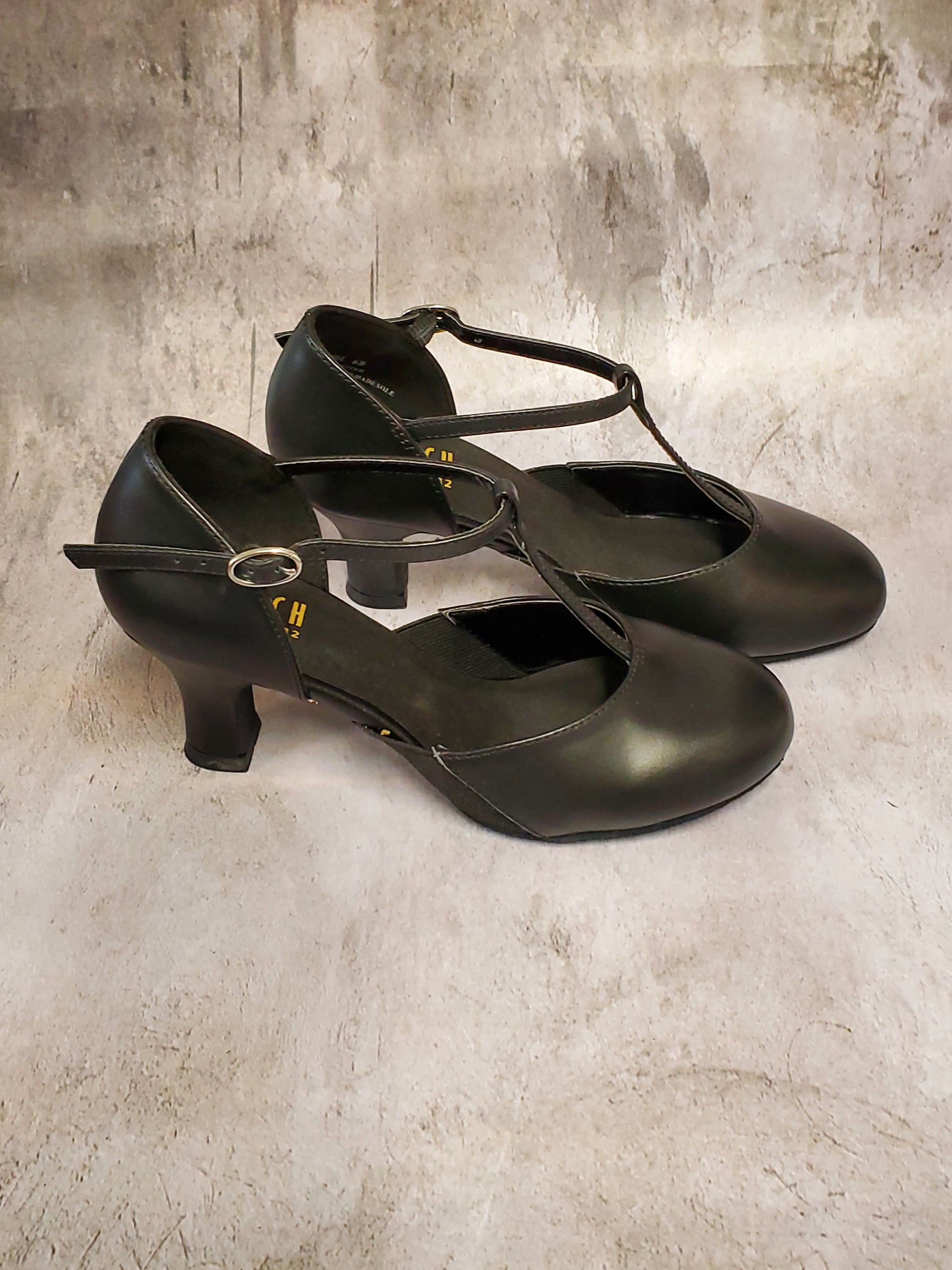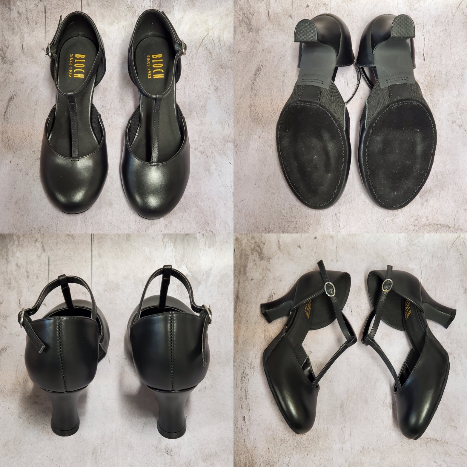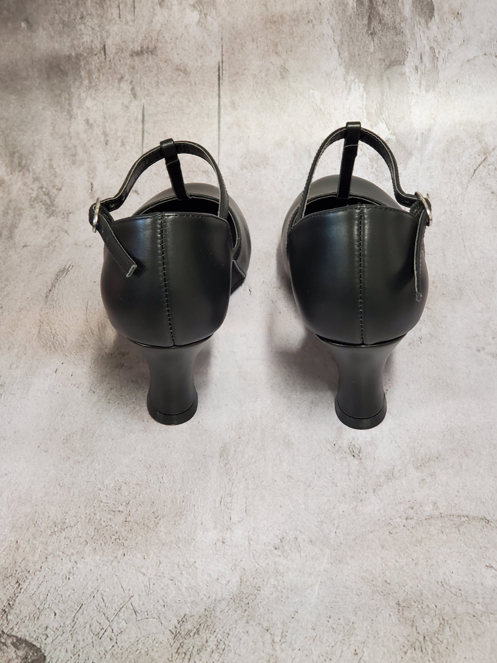 - Ankle T-bar strap with pin buckle attached with elastic to allow movement of the foot while easing tension on the instep