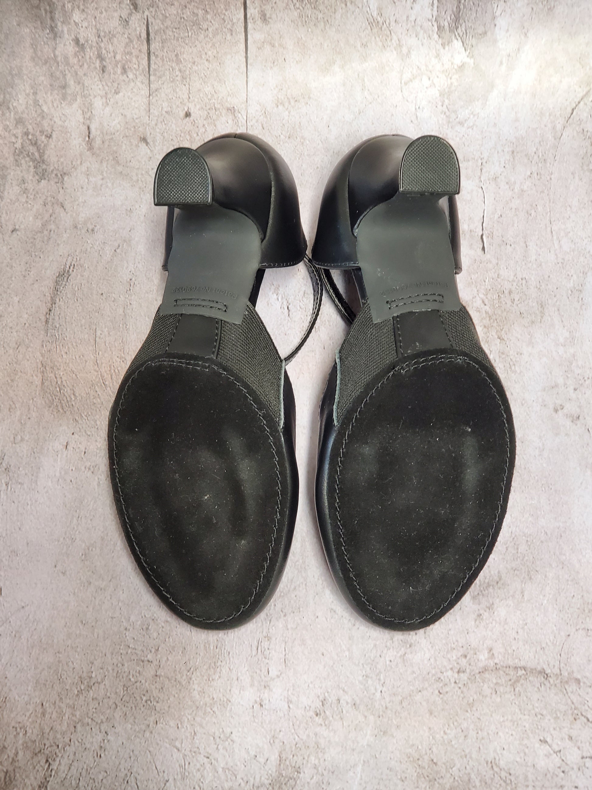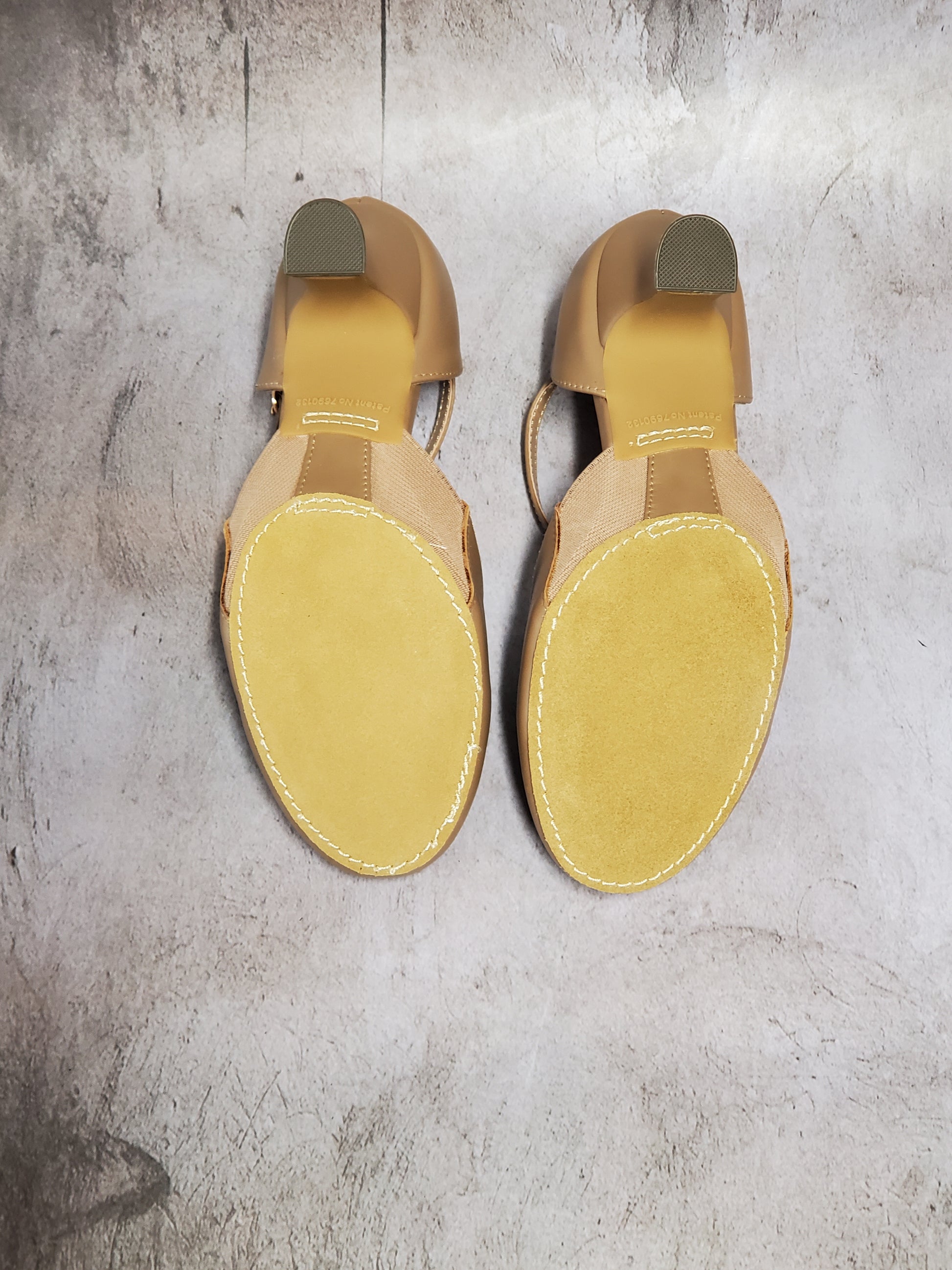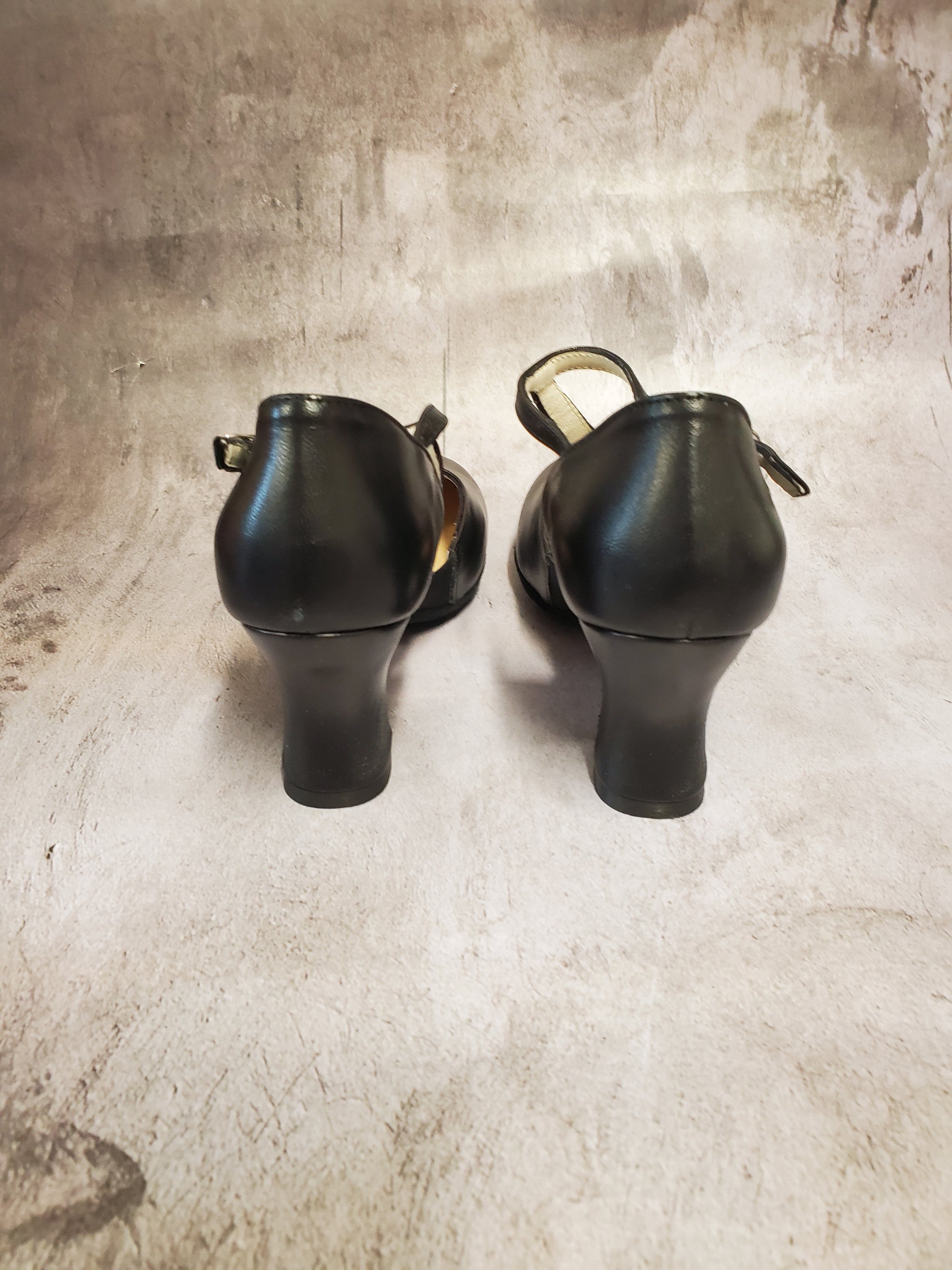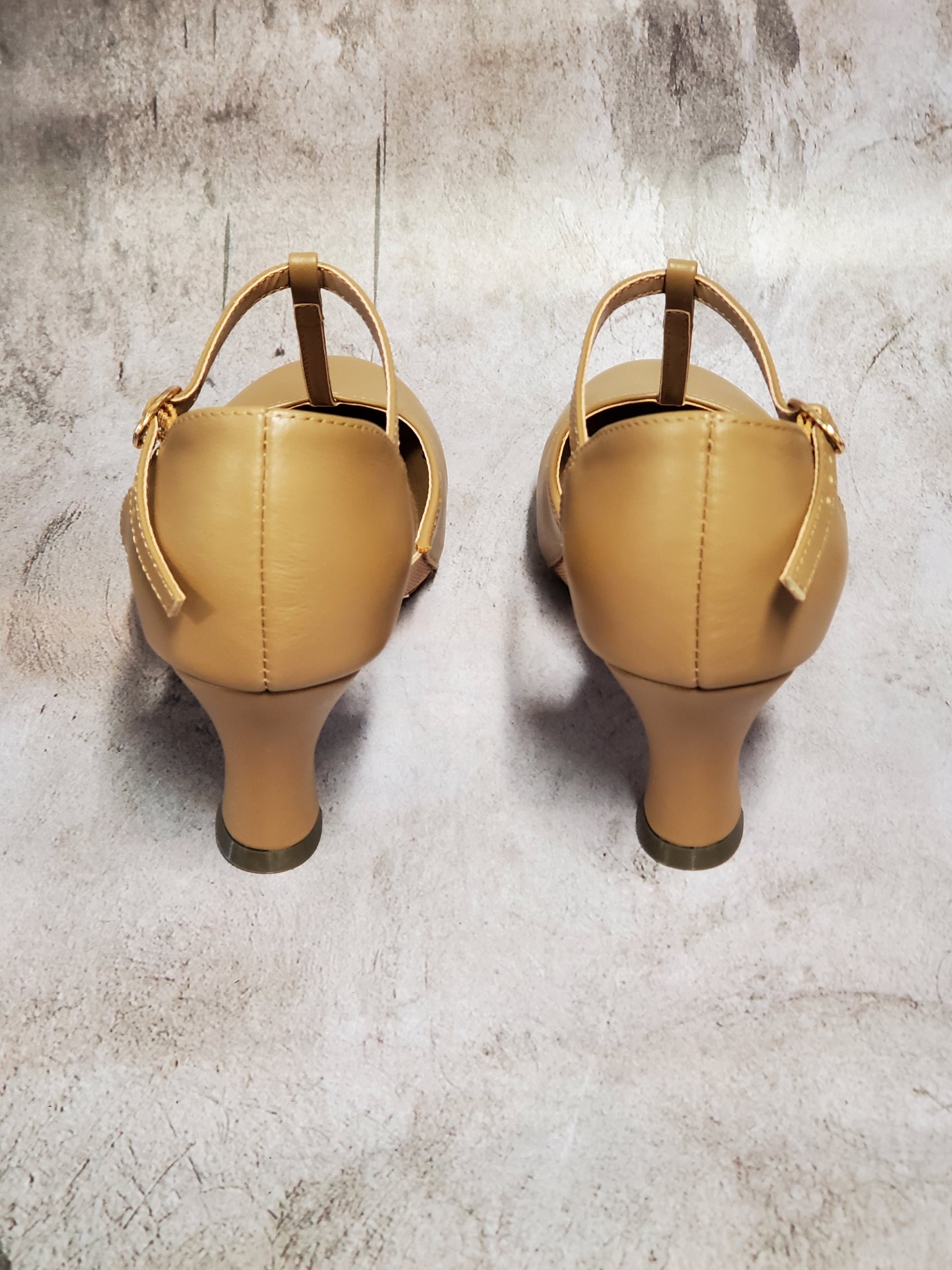 - Ankle T-bar strap with pin buckle attached with elastic to allow movement of the foot while easing tension on the instep